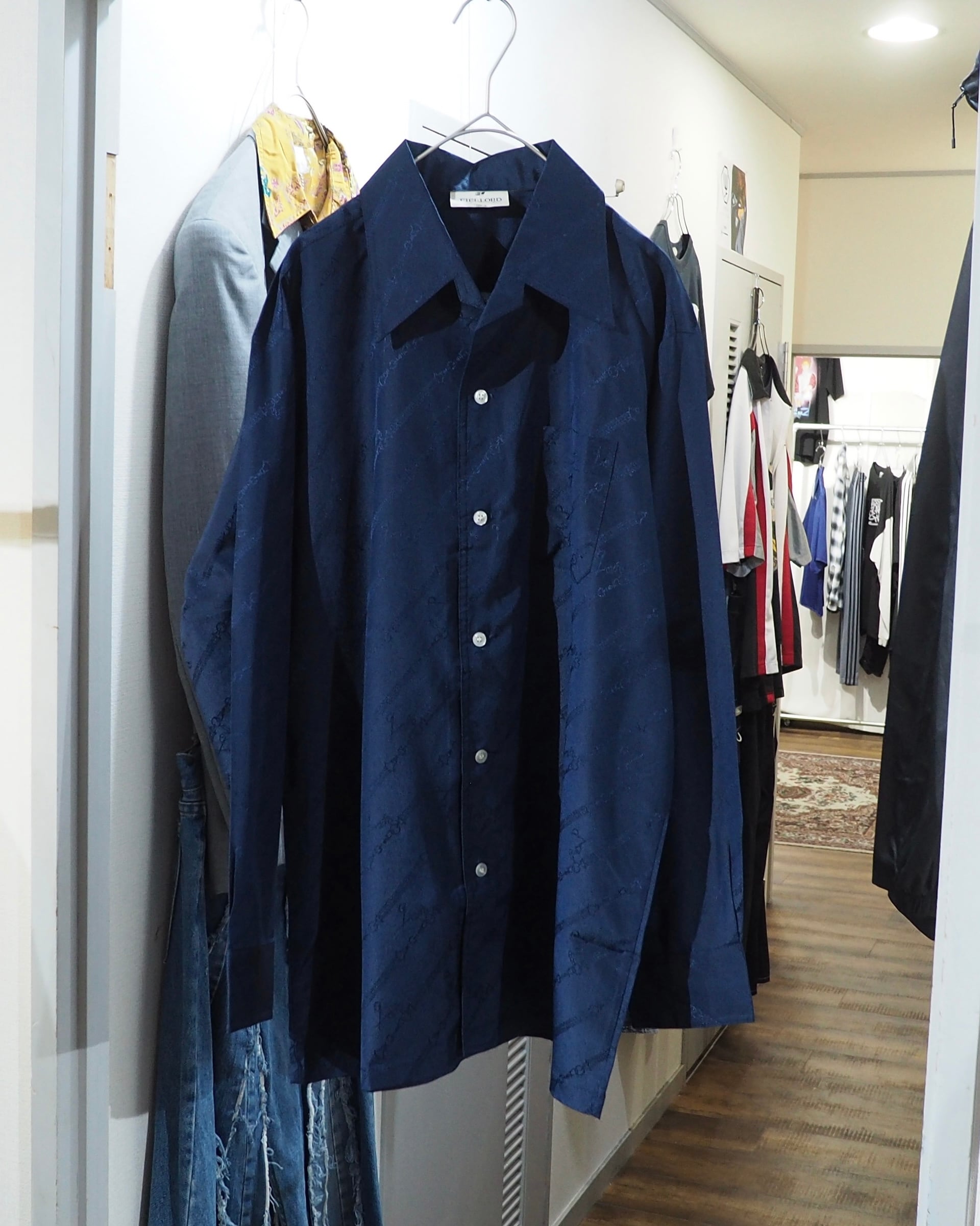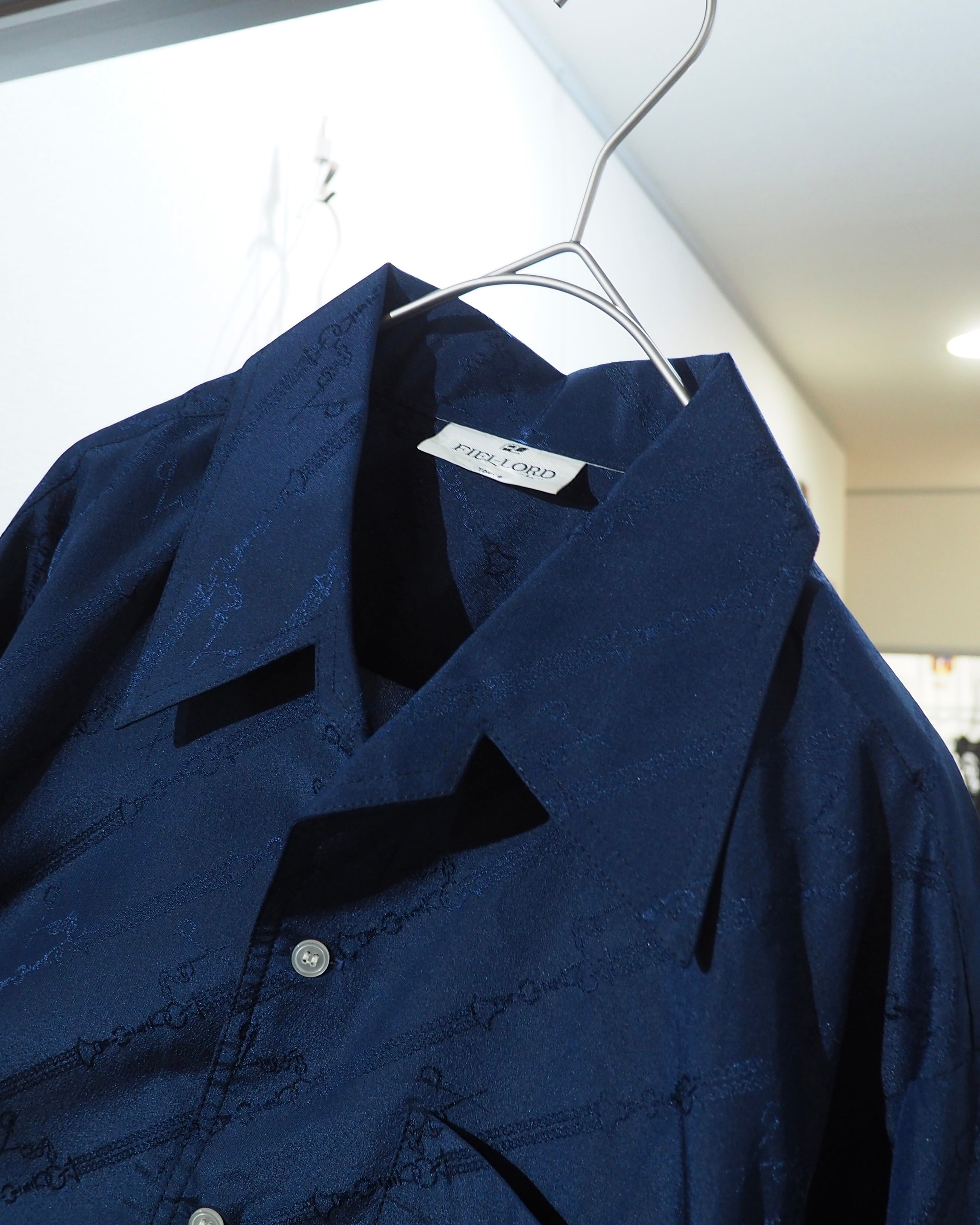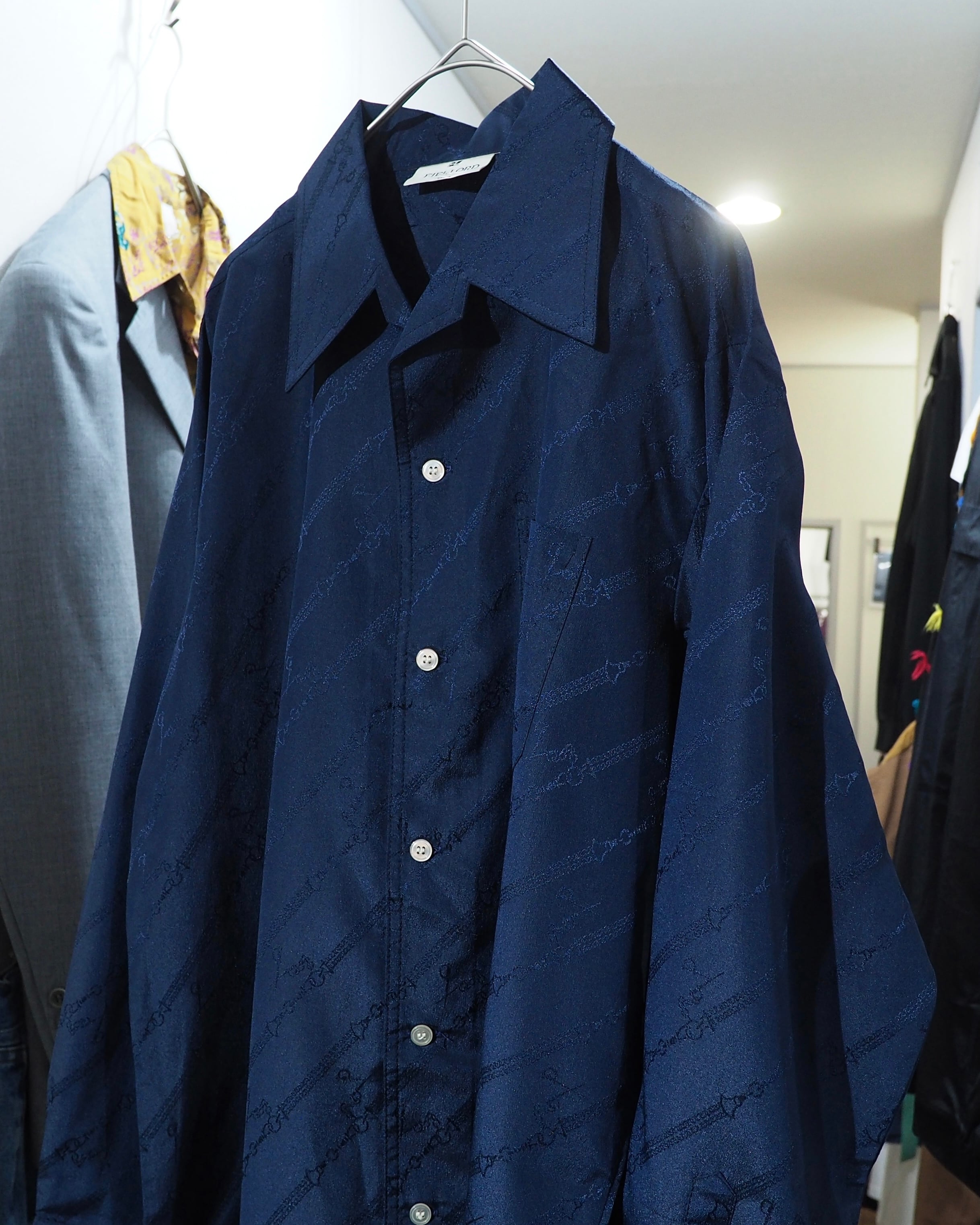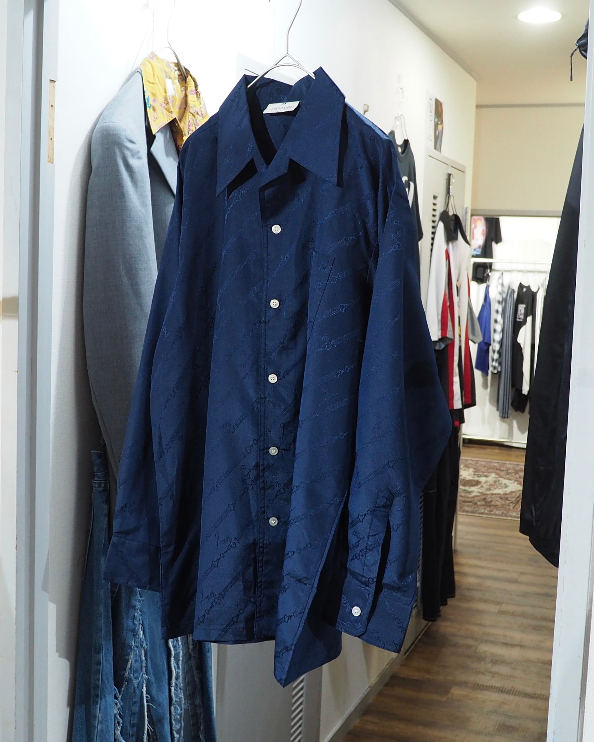 深く沈むような濃紺ダークブルーをベースに、繊細に転写された幾何学模様が静かに浮かび上がるラグジュアリーモードなシャツ。光の当たり方や動きによって表情を変えるその佇まいに惑わされて。