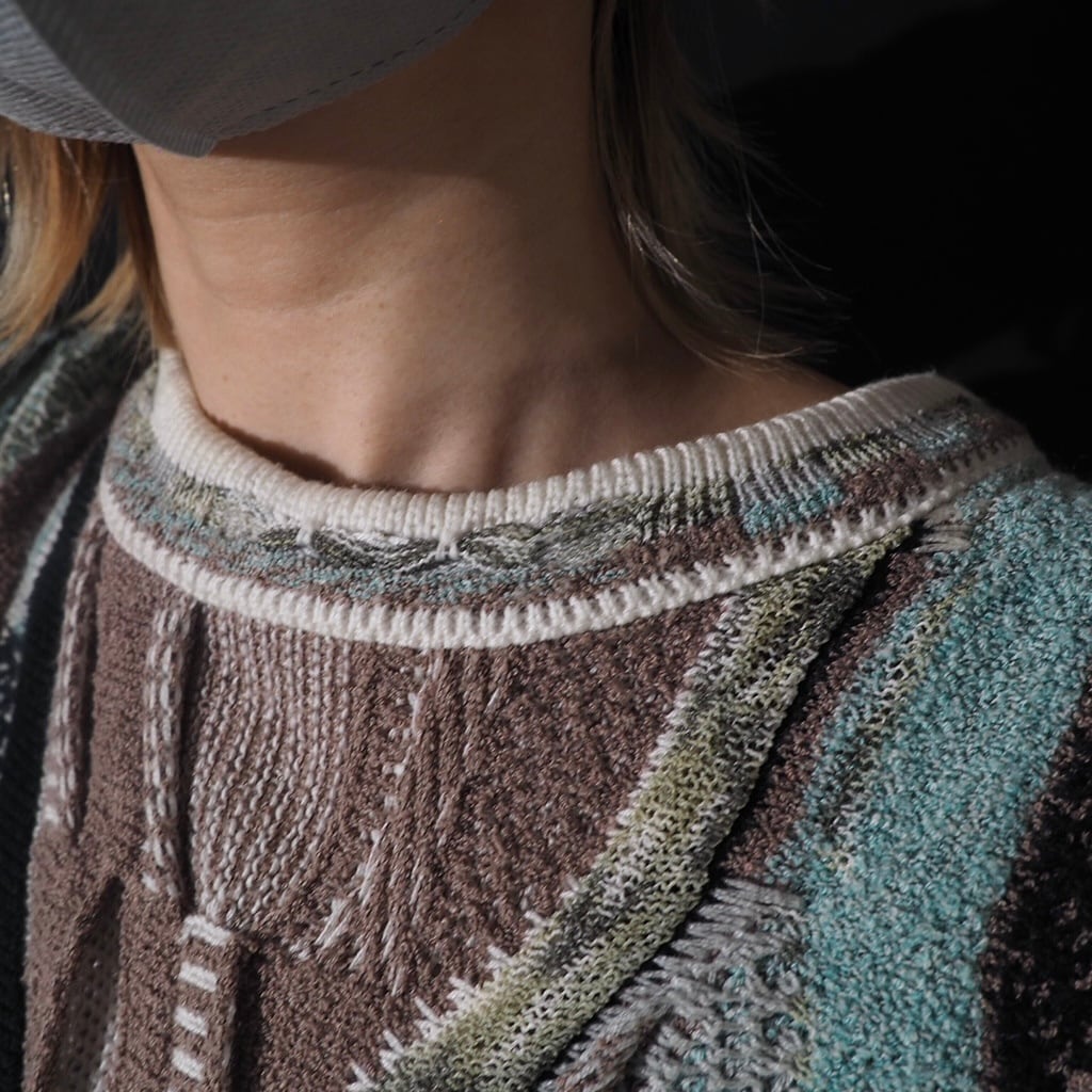 畝る立体刺繍にグリーン、ホワイト、ブラック、ブラウン等のマルチカラーが美しく雰囲気の良い3Dニット。