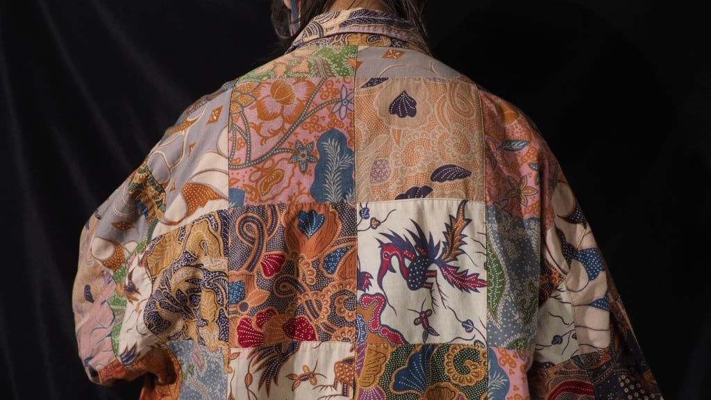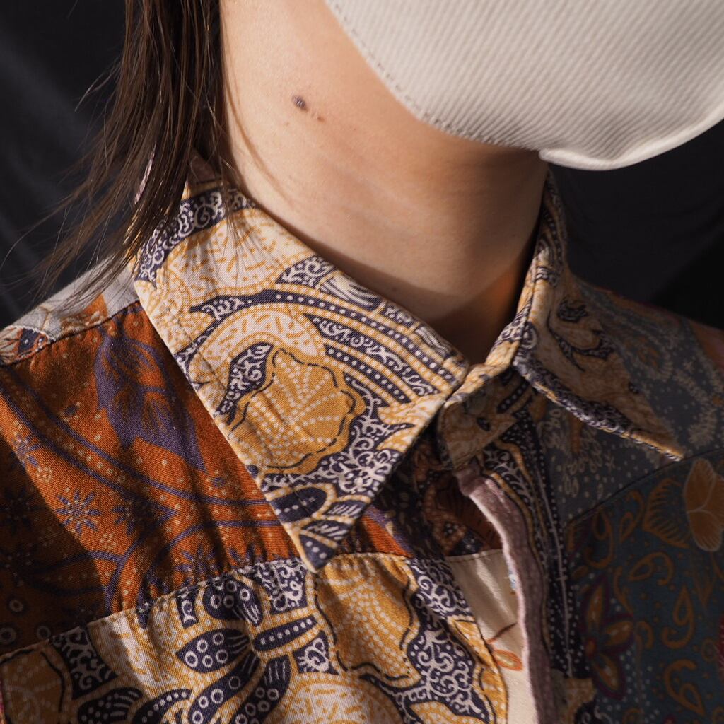エスニックかつアジアンな雰囲気を感じる古布を分解、再構築し、繋ぎ組み合わせたコットンシャツ。