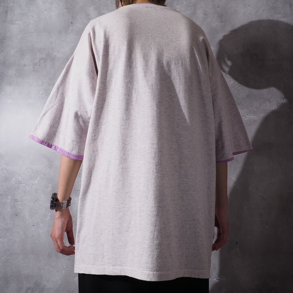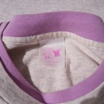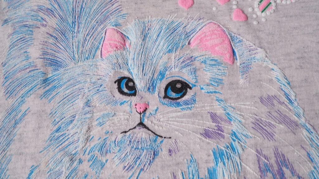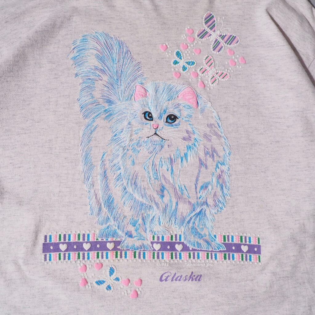 淡いライトグレイのボディにペールパープル切り替え、高感度なペルシャ猫プリントが魅力的な逸品。立体感のあるプリントや、きらきらと輝くラメ加工とヴィンテージらしい拘りを随所に散らして。是非に◎