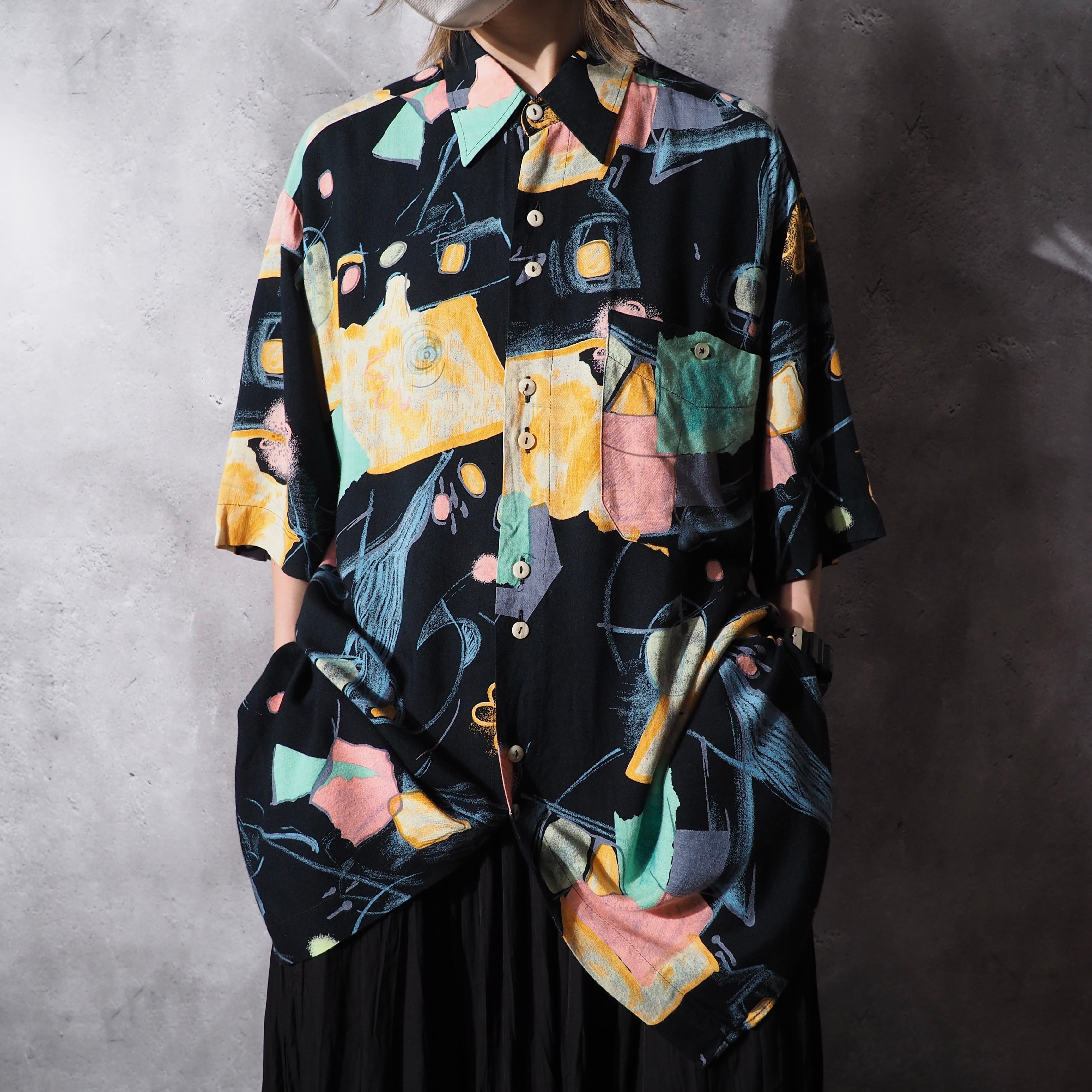 やわらかなブラックレーヨンのボディに無作為に描かれたサーモンピンク、ライトイエロー、ミントグリーンのコンテンポラリーアートが美しく雰囲気の良いデザインシャツ。