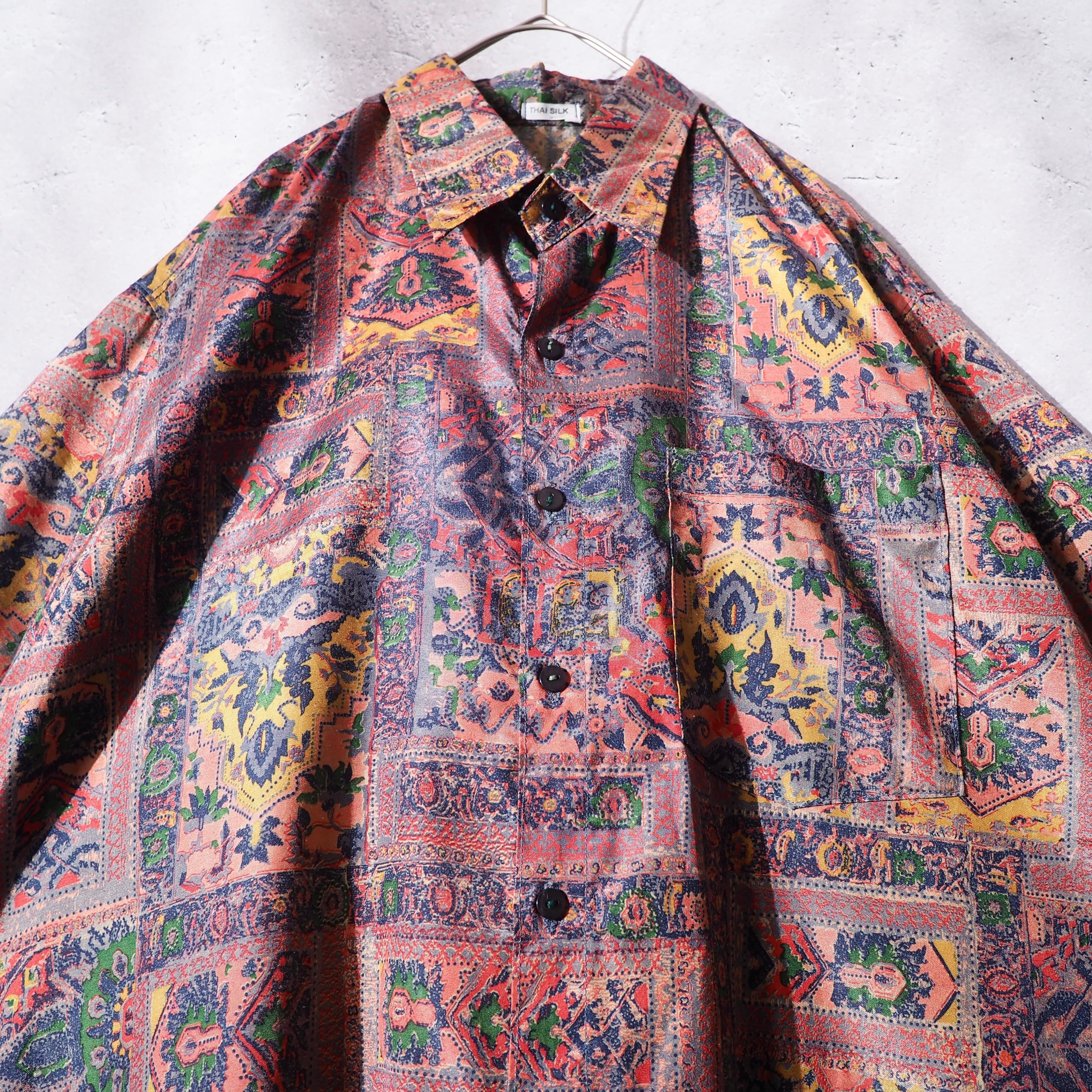 1990s ” Thai silk ” ethnic art printed box drape silk shirt