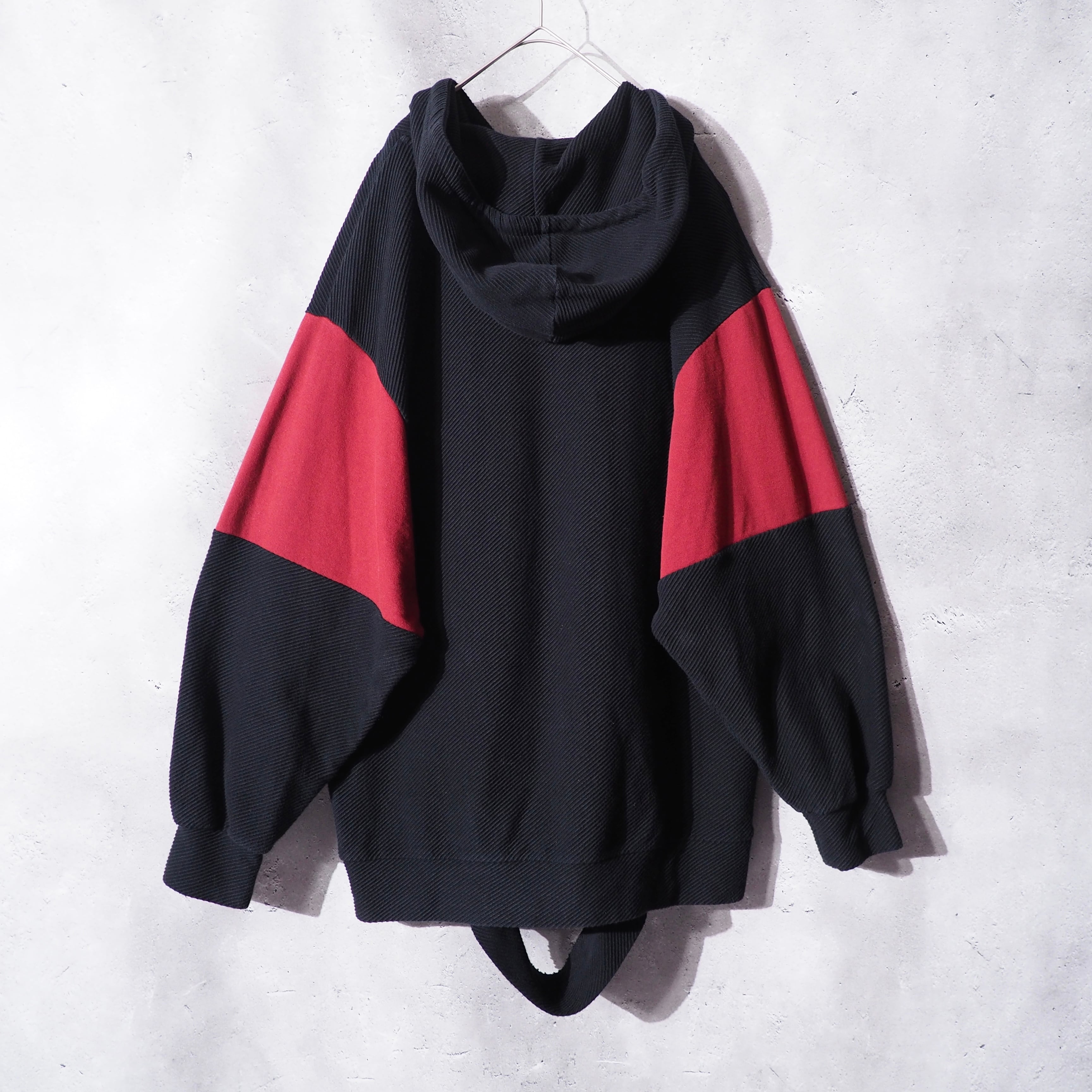 キャッチーな刺繍に、ブラック×ボルドーのGoodな配色、切込みが入る事により変化する丈先のデザインと随所に遊び心を感じるスペシャルピース。ボリューム感のあるフーディや立体感のある生地感も良いですね◎