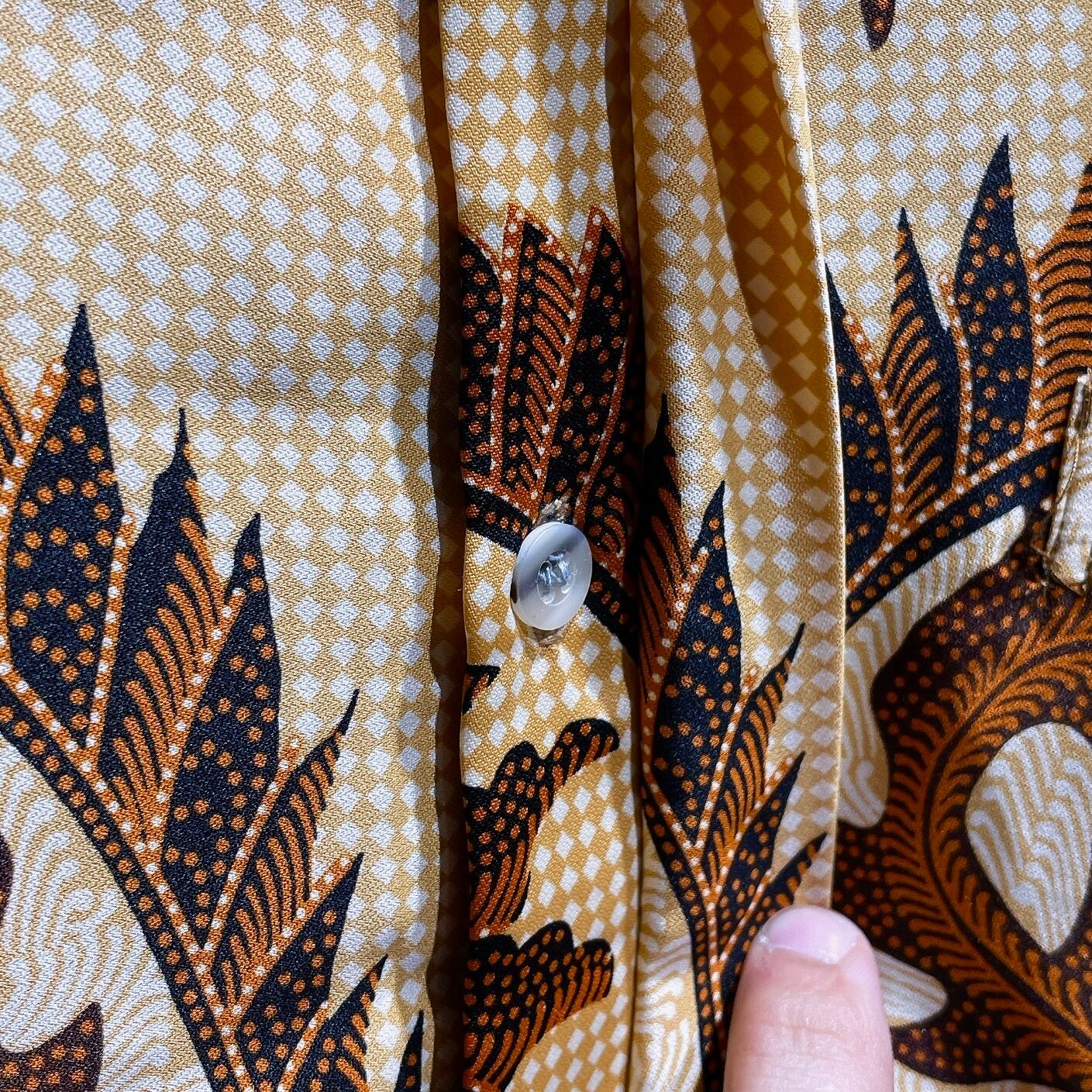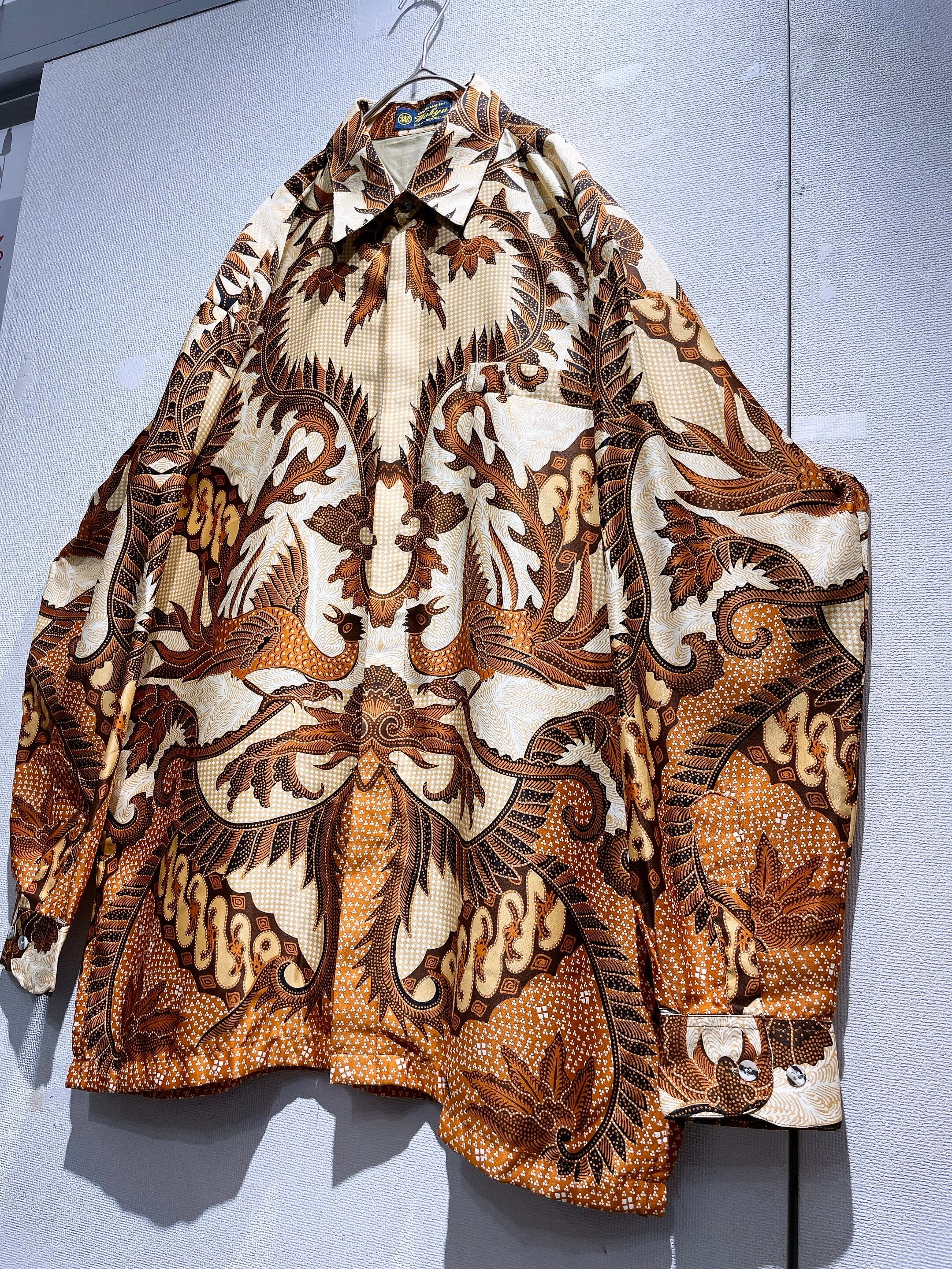 そんな深みのある配色のバティックを、とろみ感のあるドレープポリに転写したスペシャルピース。滲み擦れの無い美しいプリントに心地よい肌触りのドレープ生地が嬉しく何処と無くですがラグジュアリーな印象も見受けられます。