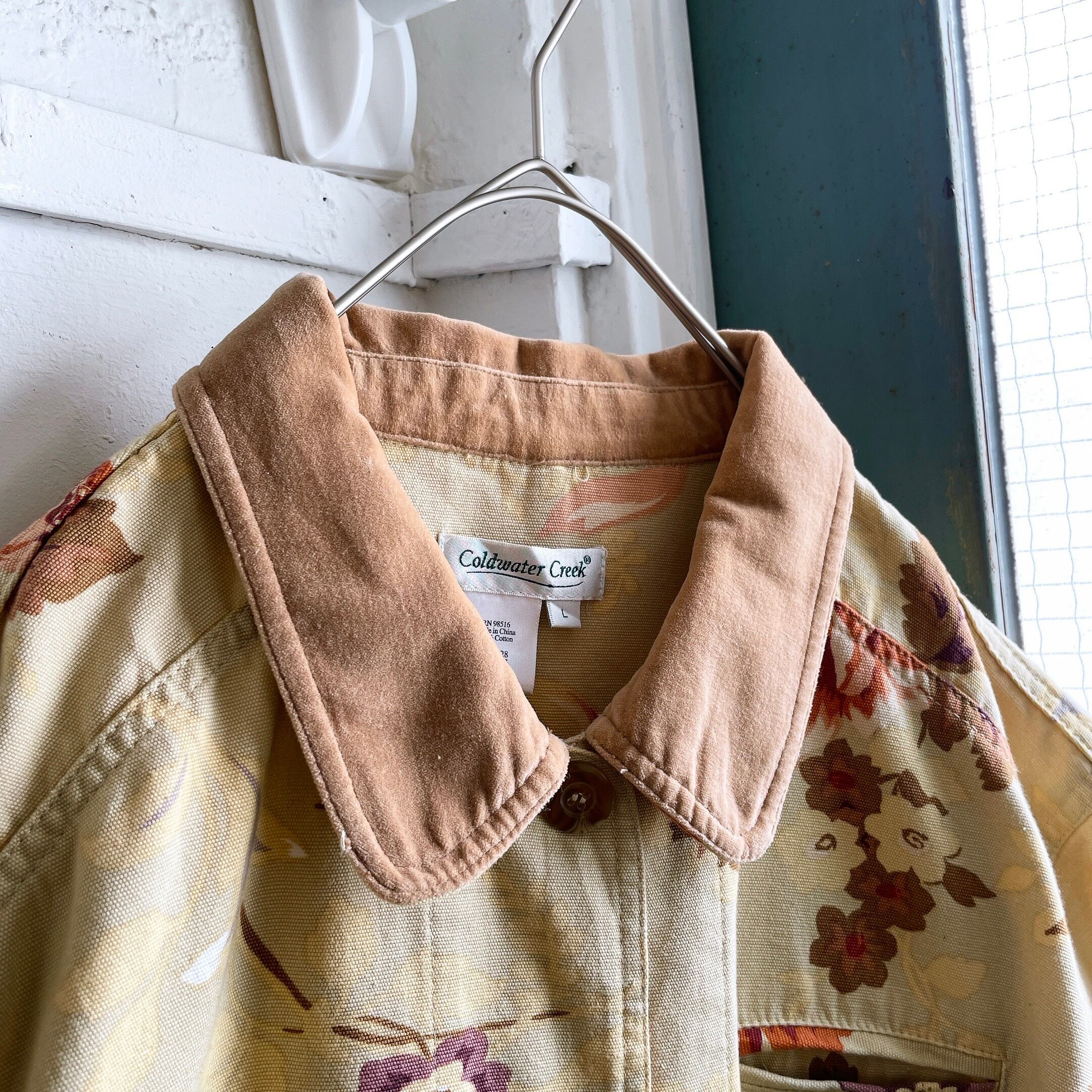 やわらかなペールトーンイエローのコットンボディに咲くボタニカルな花柄がレトロラグジュアリーなカバーオールジャケット。