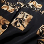 とろみのある光沢ブラックポリに描かれた民族的エスニックアートがラグジュアリー×モードな印象を受けるジャケット。
