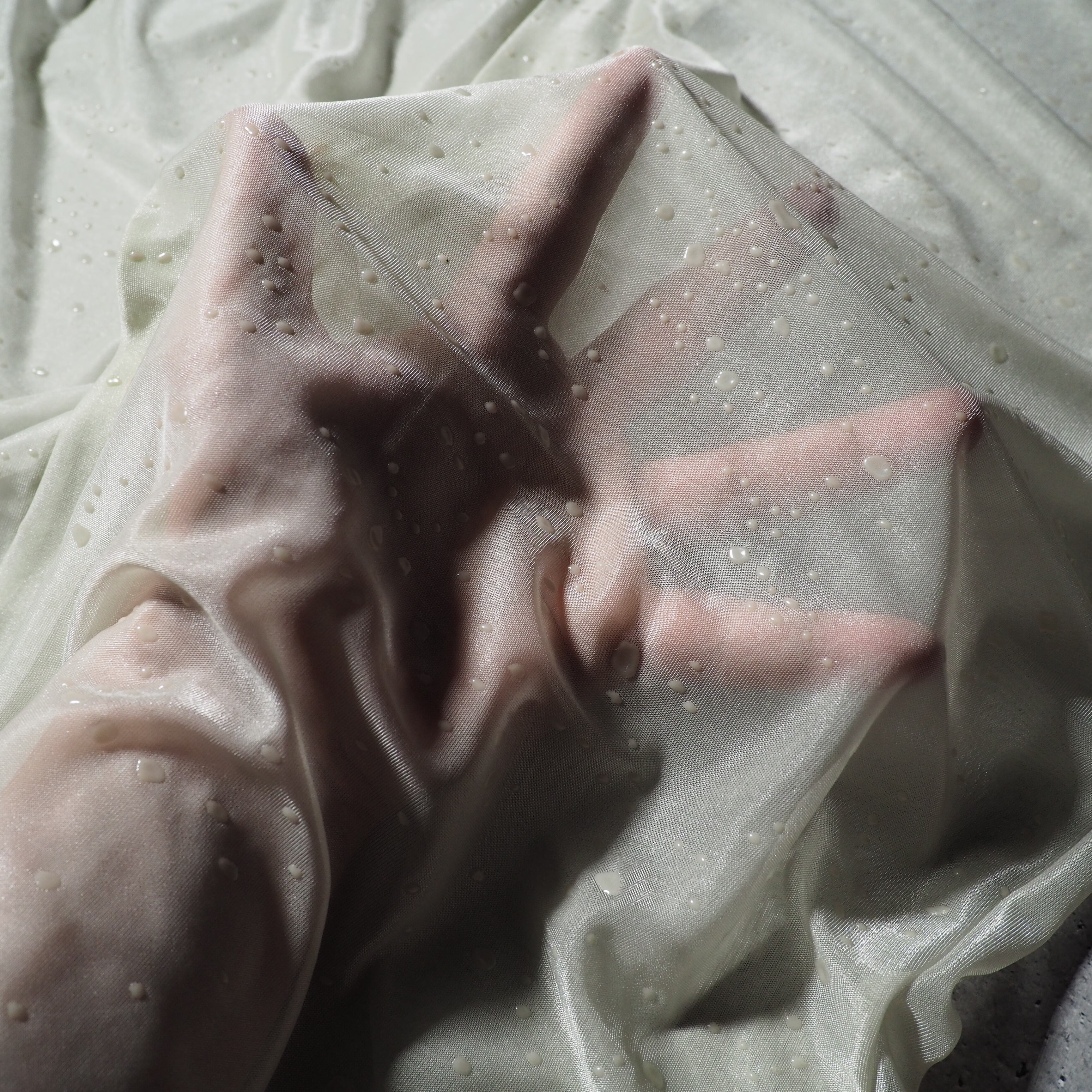 透け感のあるホワイトポリに立体ペイントプリントが塗されたオープンカラーシャツ。