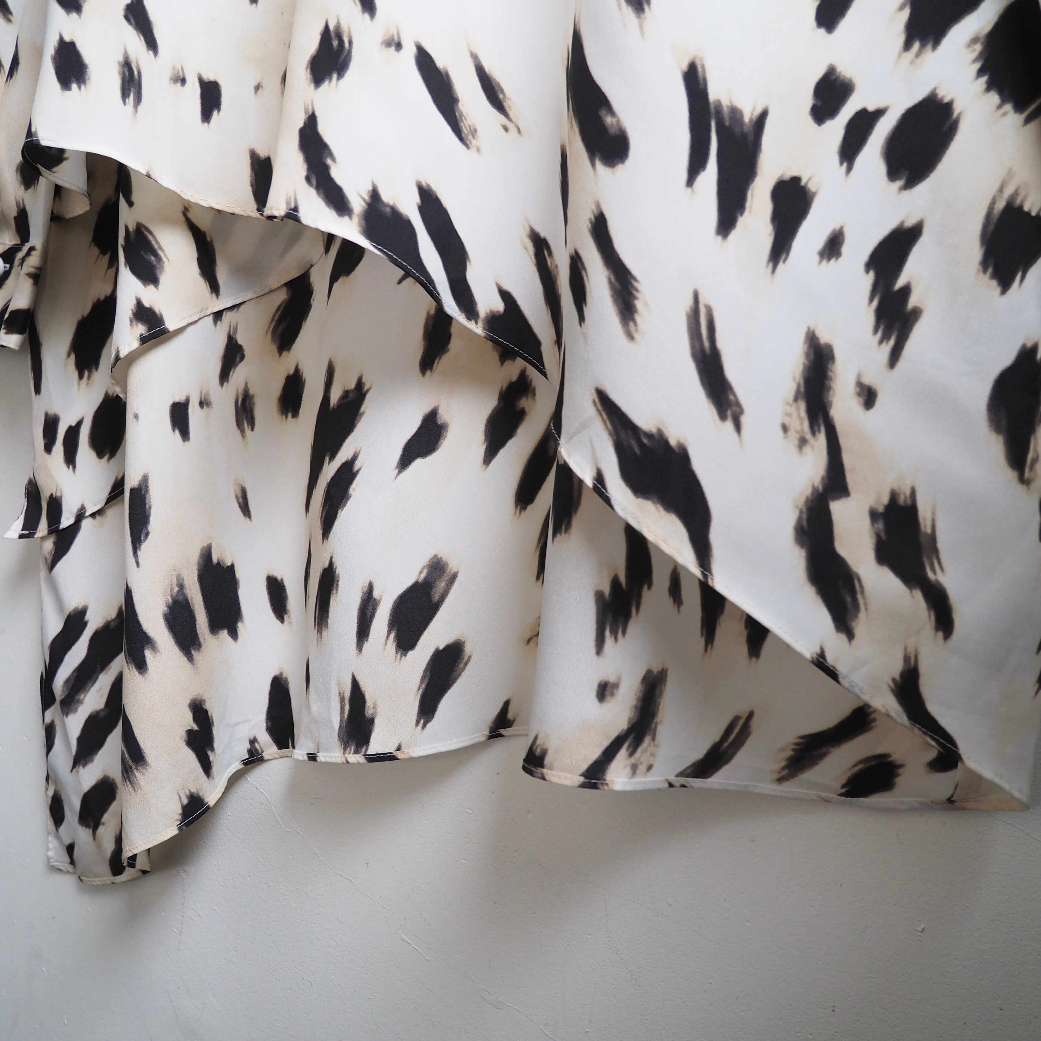 前後で異なる丈感に、同素材を重ね合わせたレイヤードデザイン。ラグジュアリモードなダルメシアン柄が目を惹き付けるプルオーバーシャツ。