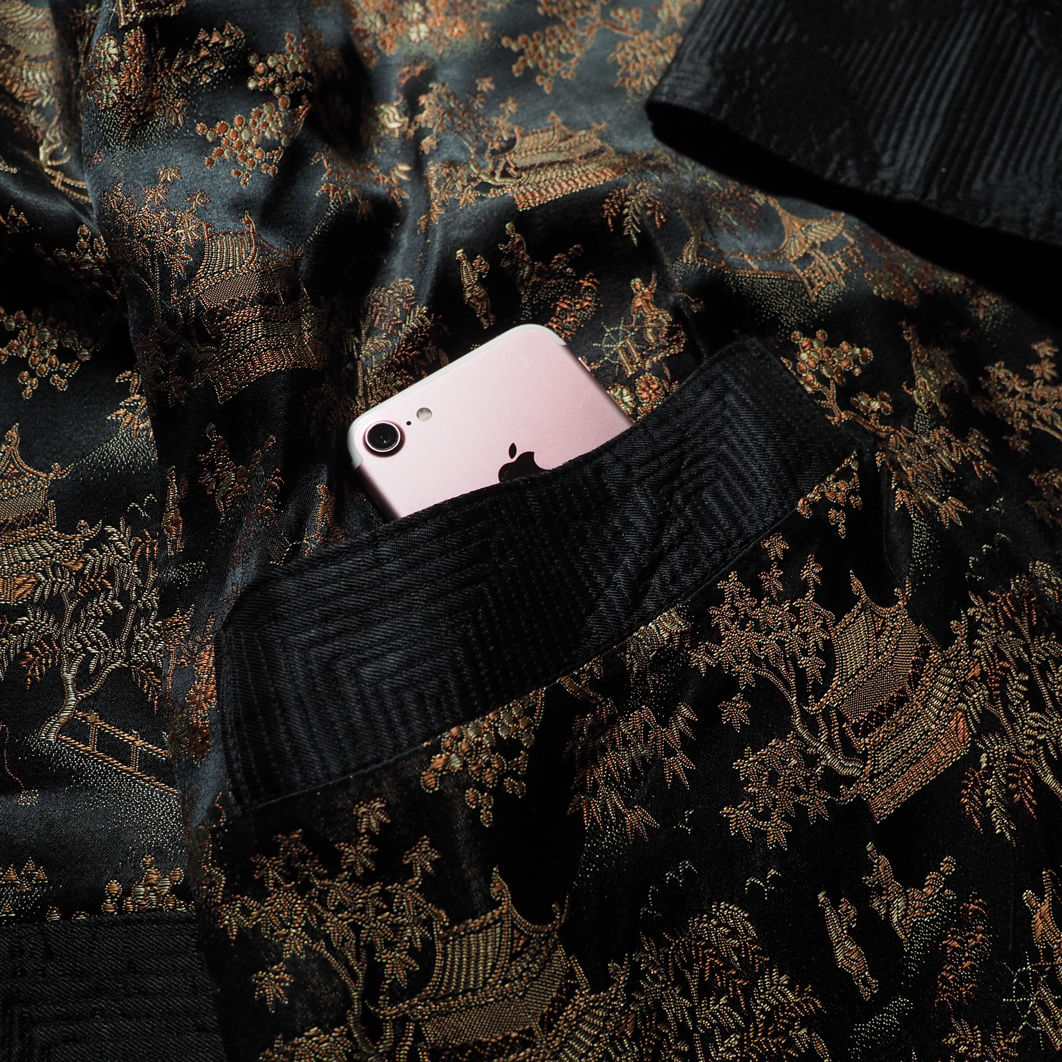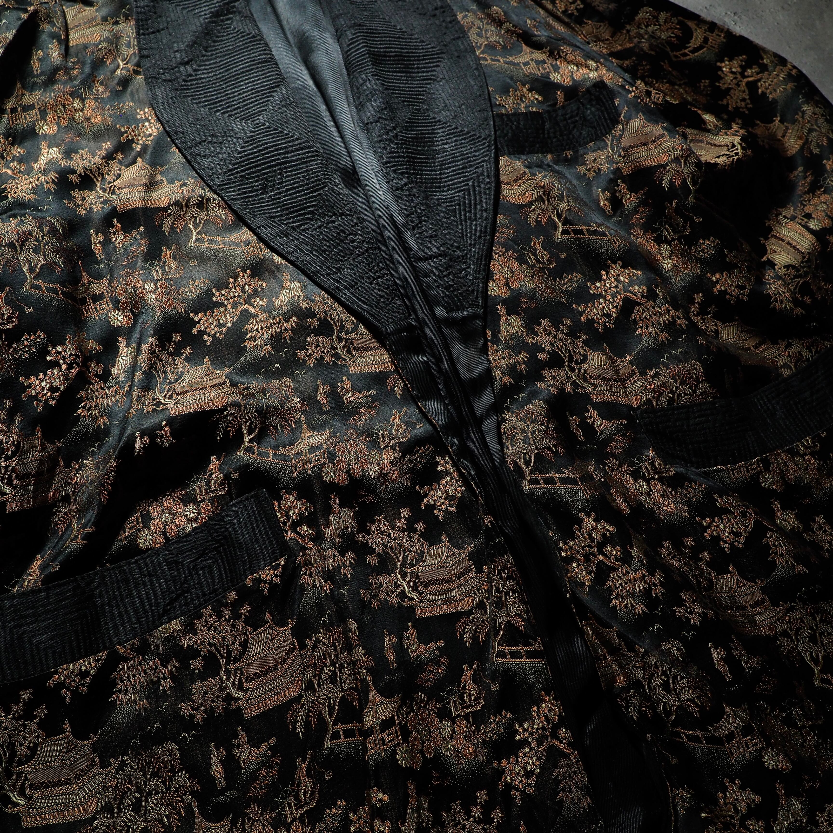 きらびやかな総シルクに織りこまれたオリエンタルな情景刺繍が美しいスモーキングジャケット。タグ等無く年代不詳ですが、1950年代頃のデザインシルエットに酷似しており、唯ならぬオーラを纏っております。加えて希少なクロモノ、大判の襟も可愛らしいですね。