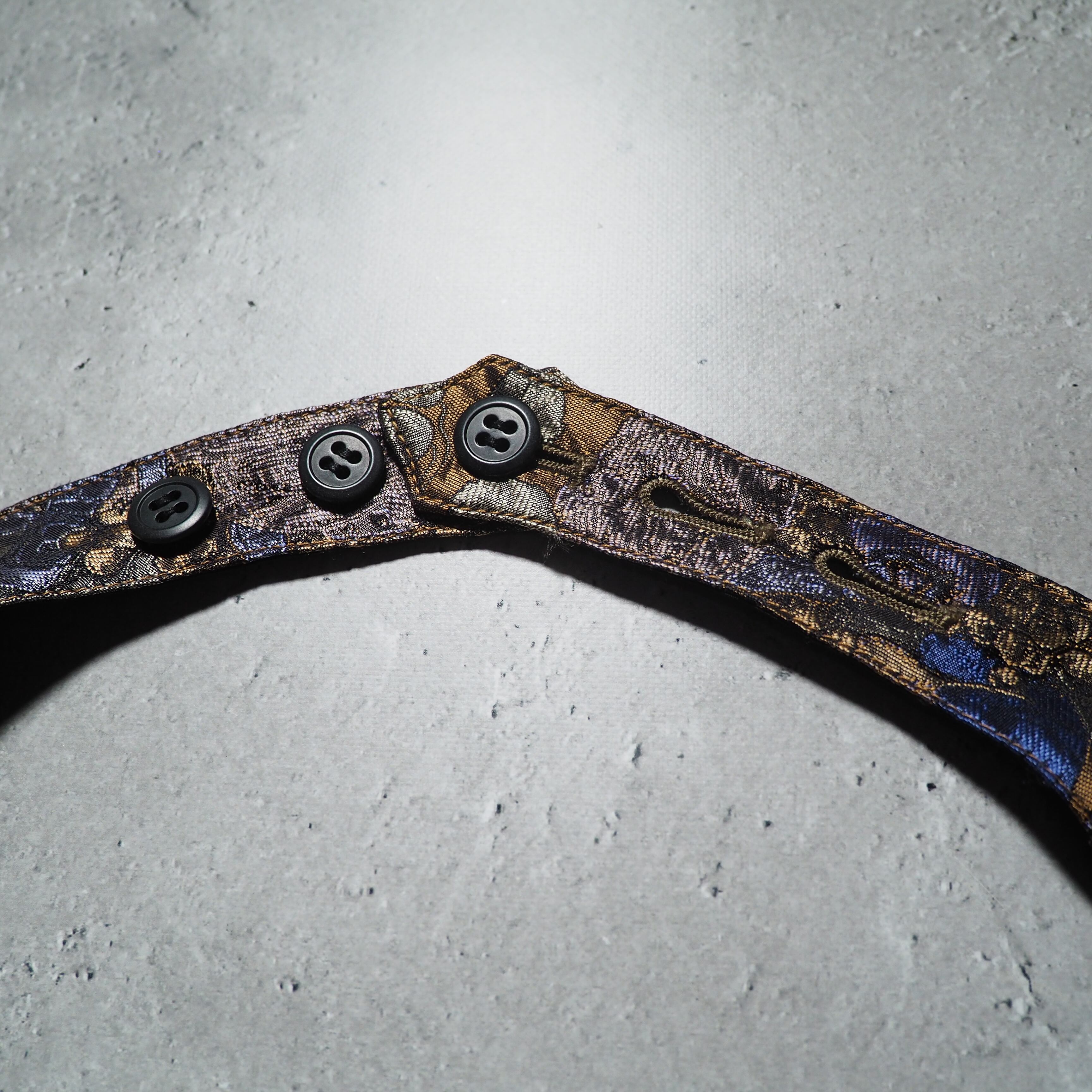 きらびやかなゴールドを主体としたシルクボディに、フルーツやチェーン、ベルトと言ったモダンラグジュアリな刺繍を落とし込んだジレベスト。通常のデザインと異なる前掛けエプロンの様な仕様がまた面白いですね。