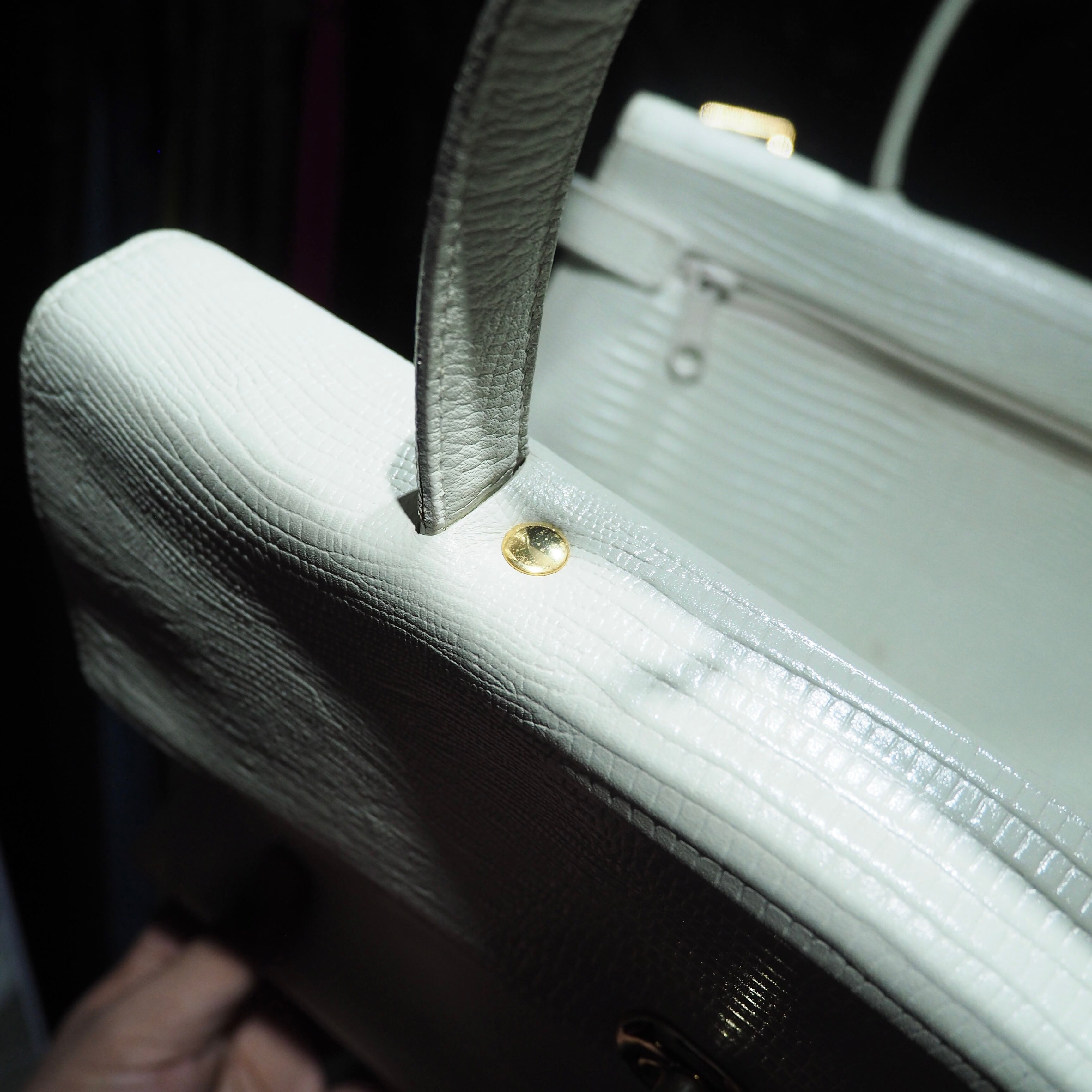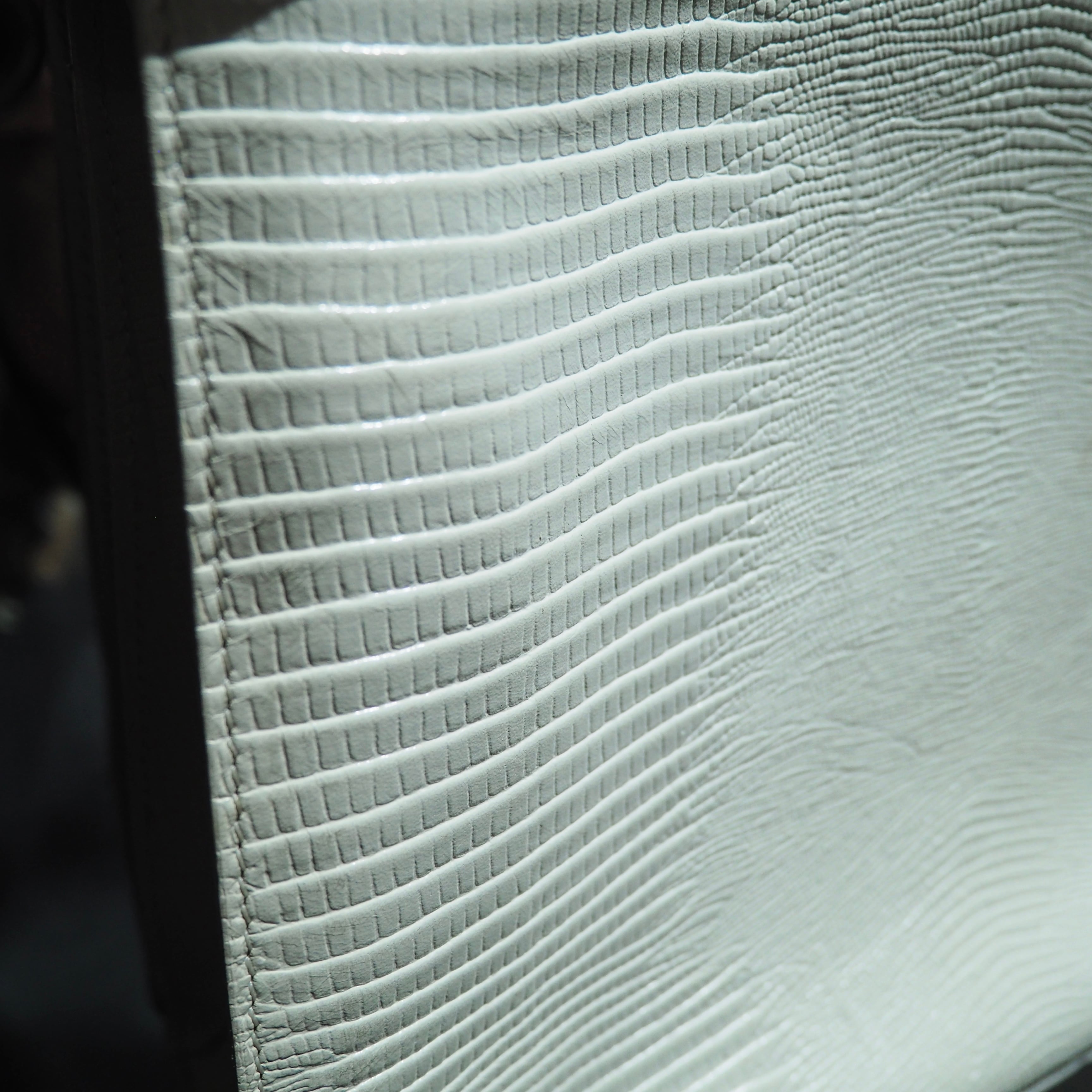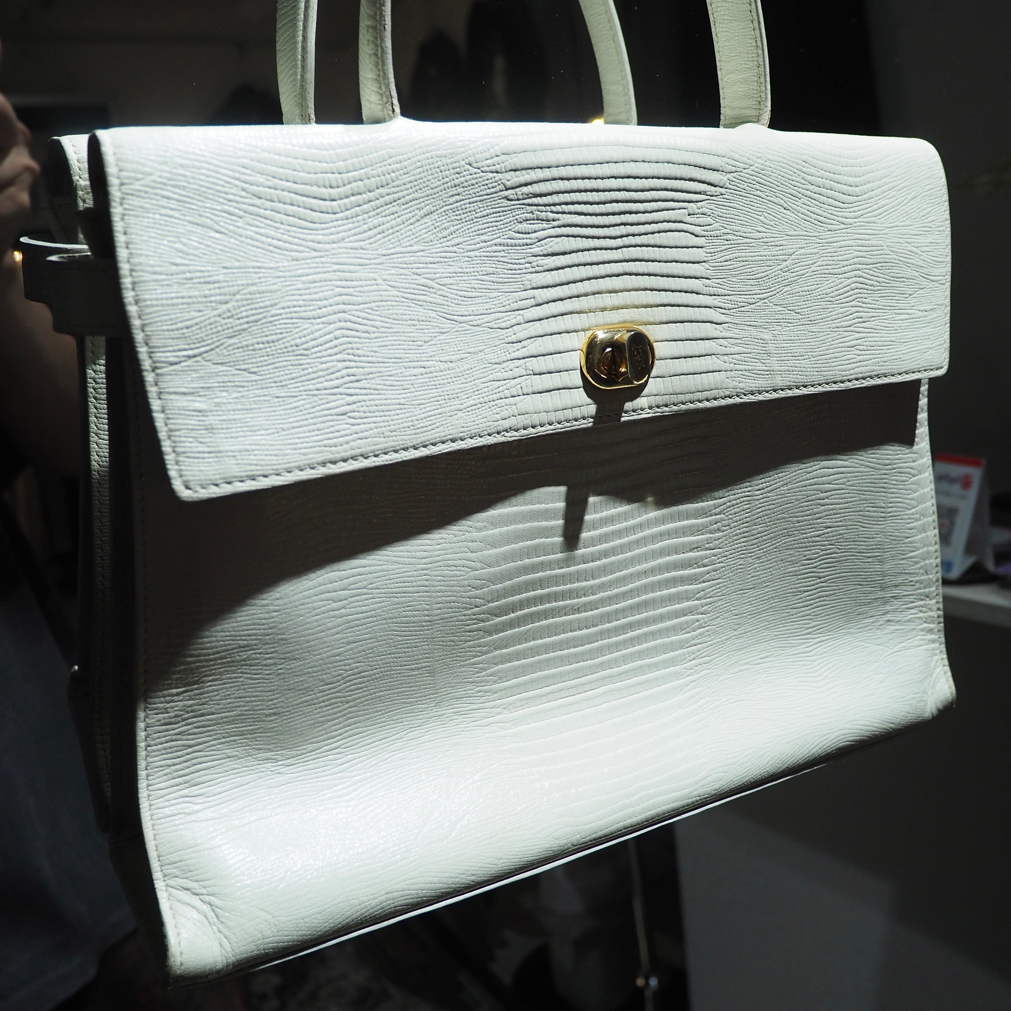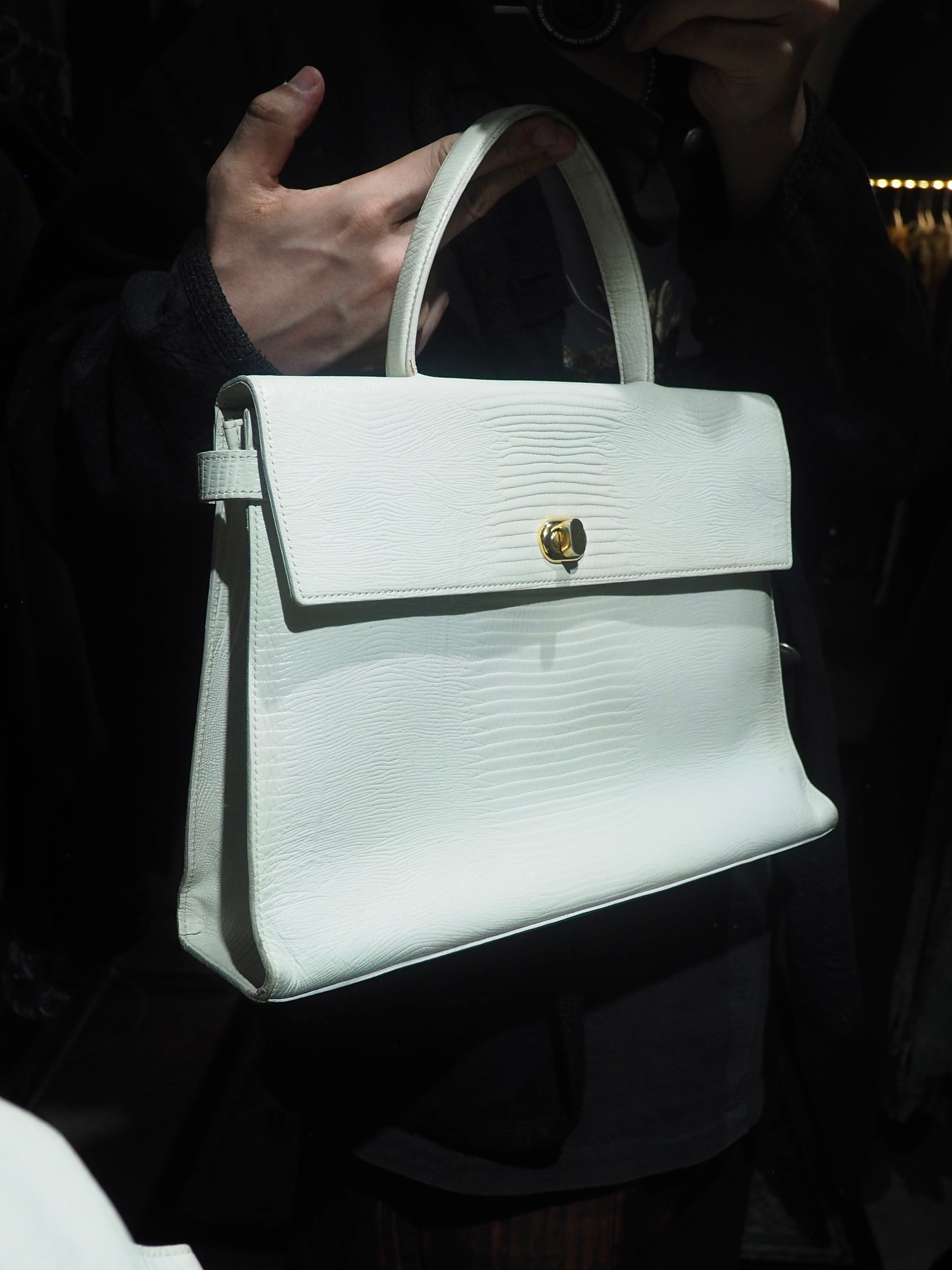 淡く、あたたかみのあるエクリュホワイトに型押しされたクロコ柄がラグジュアリモードなハンドバッグ。