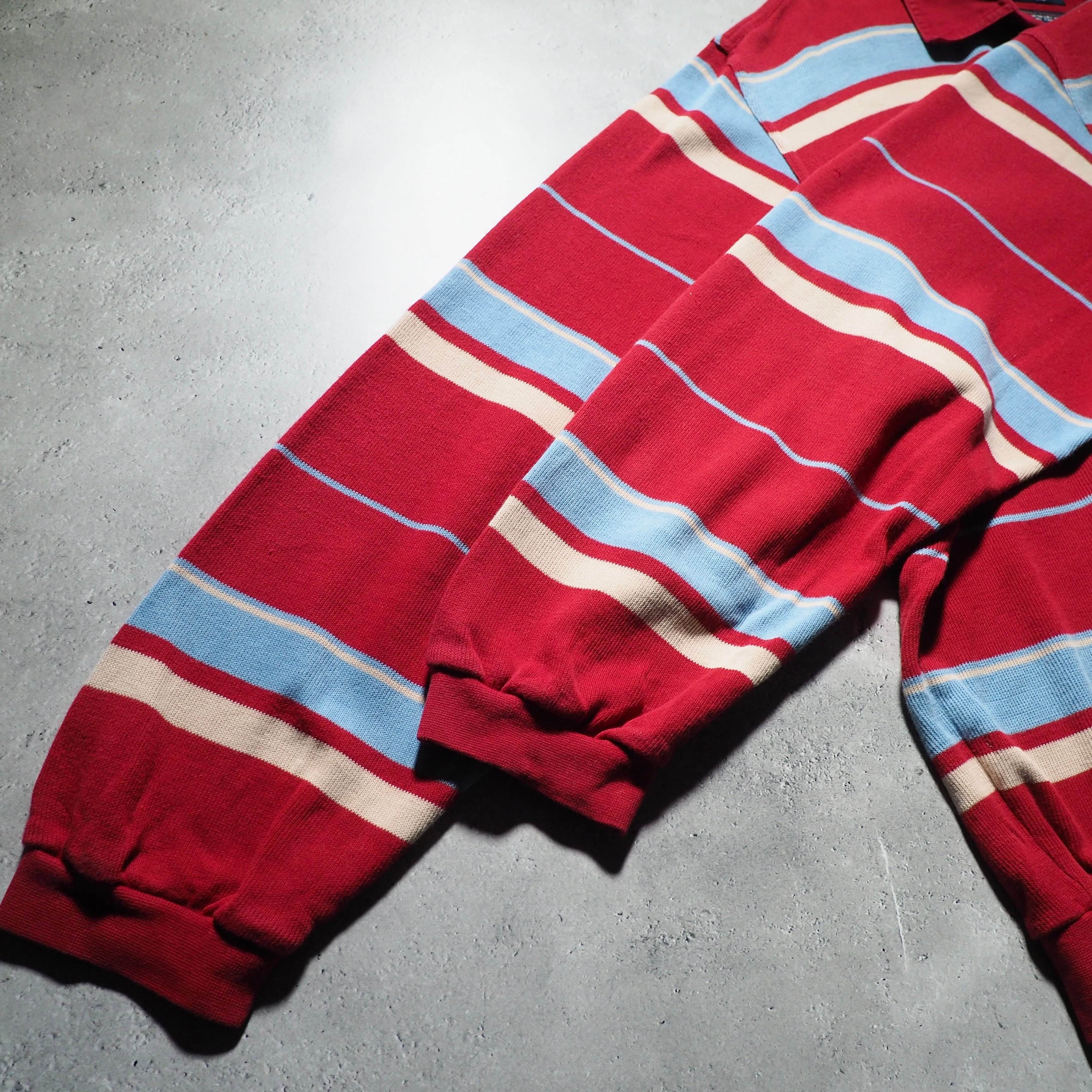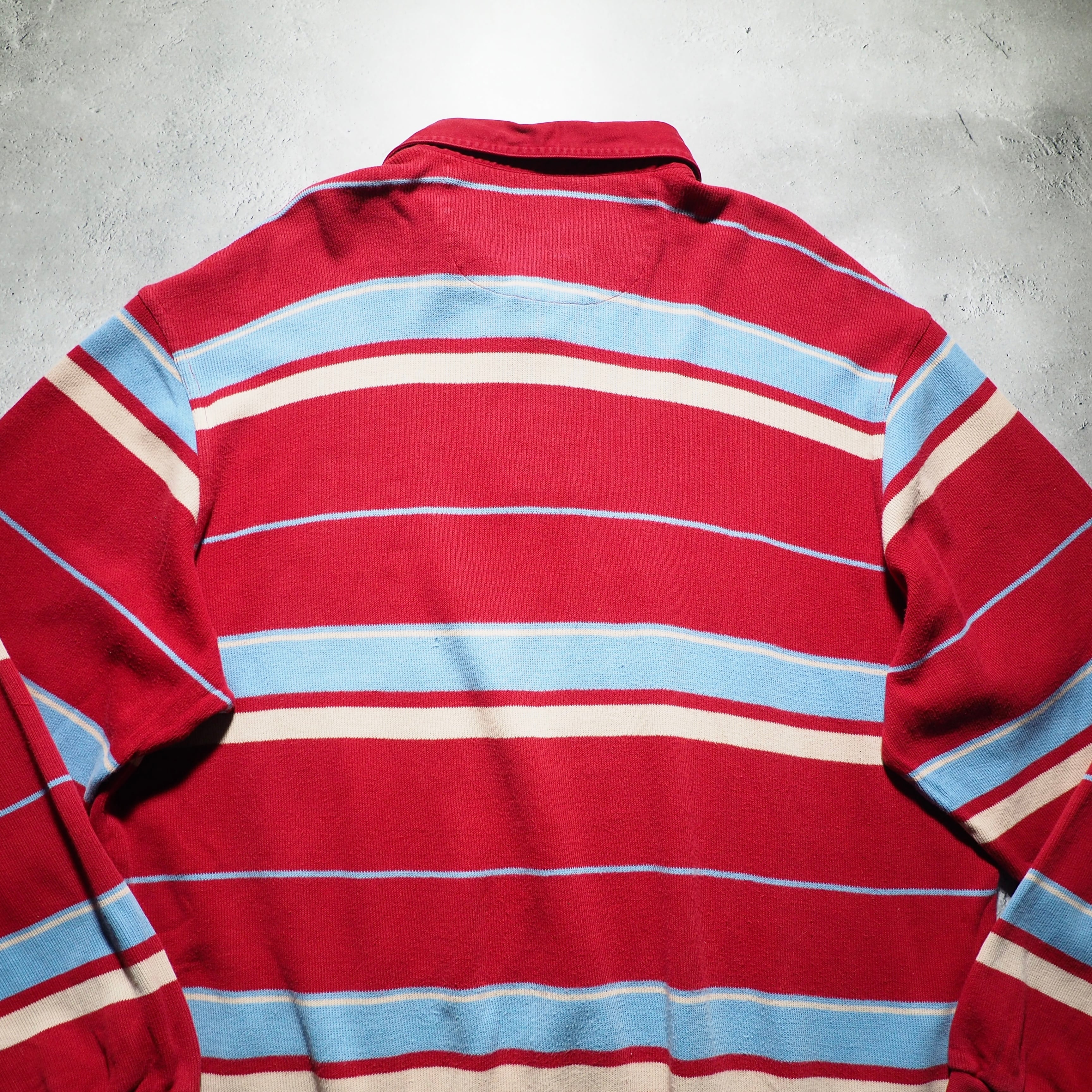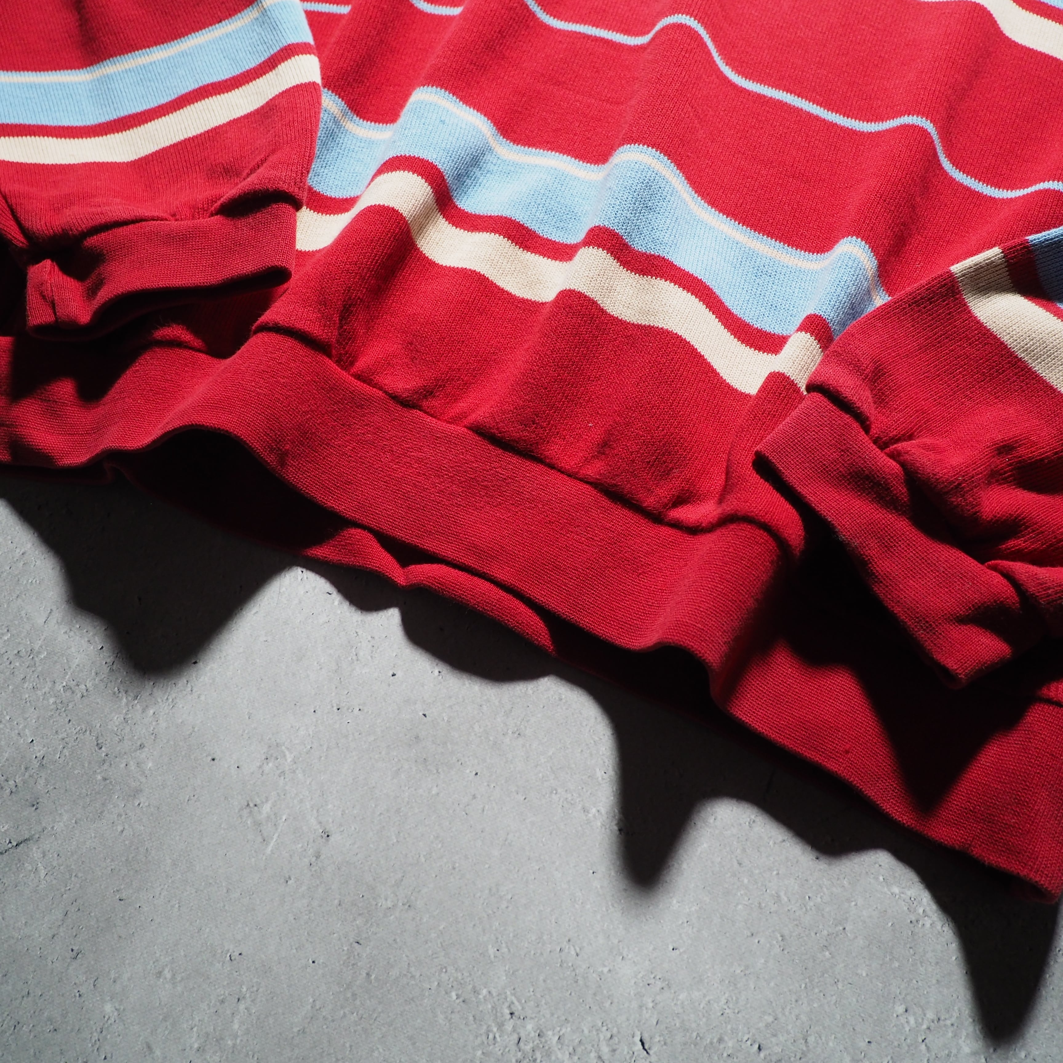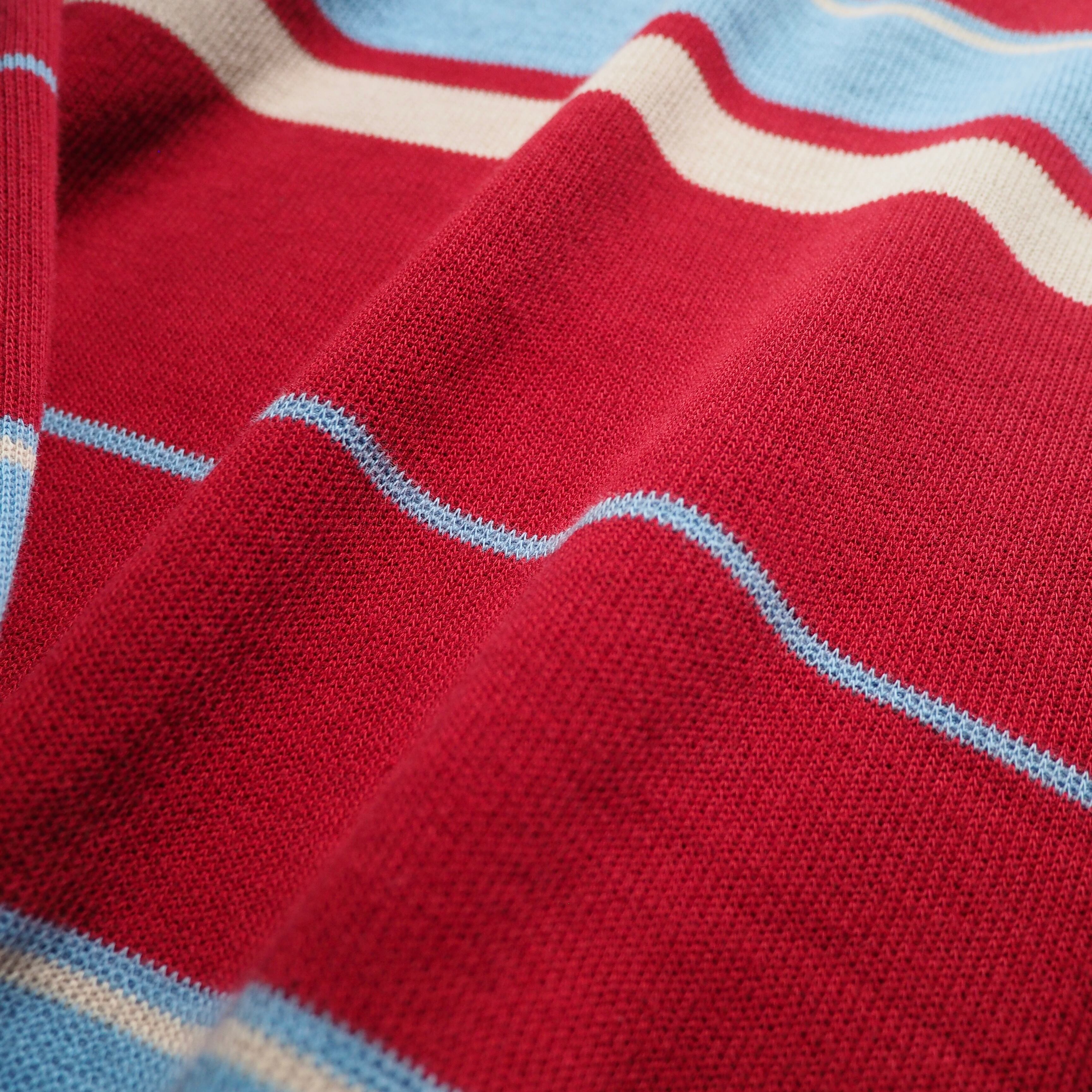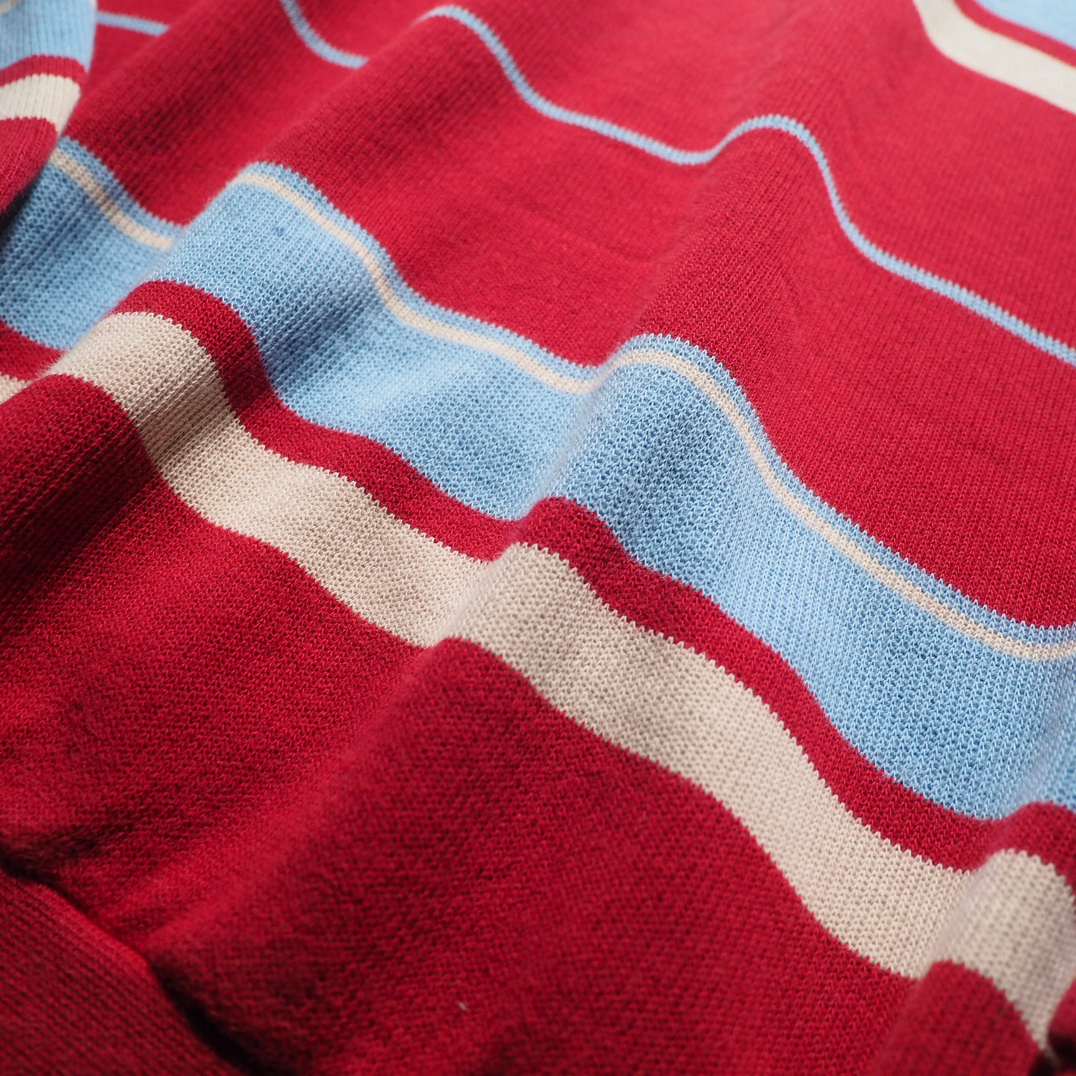 発色の良いレッドを主体としたコットンニットに、ライトブルー、クリームのボーダーラインを組み合わせたニットポロ。お色がただただ可愛い。