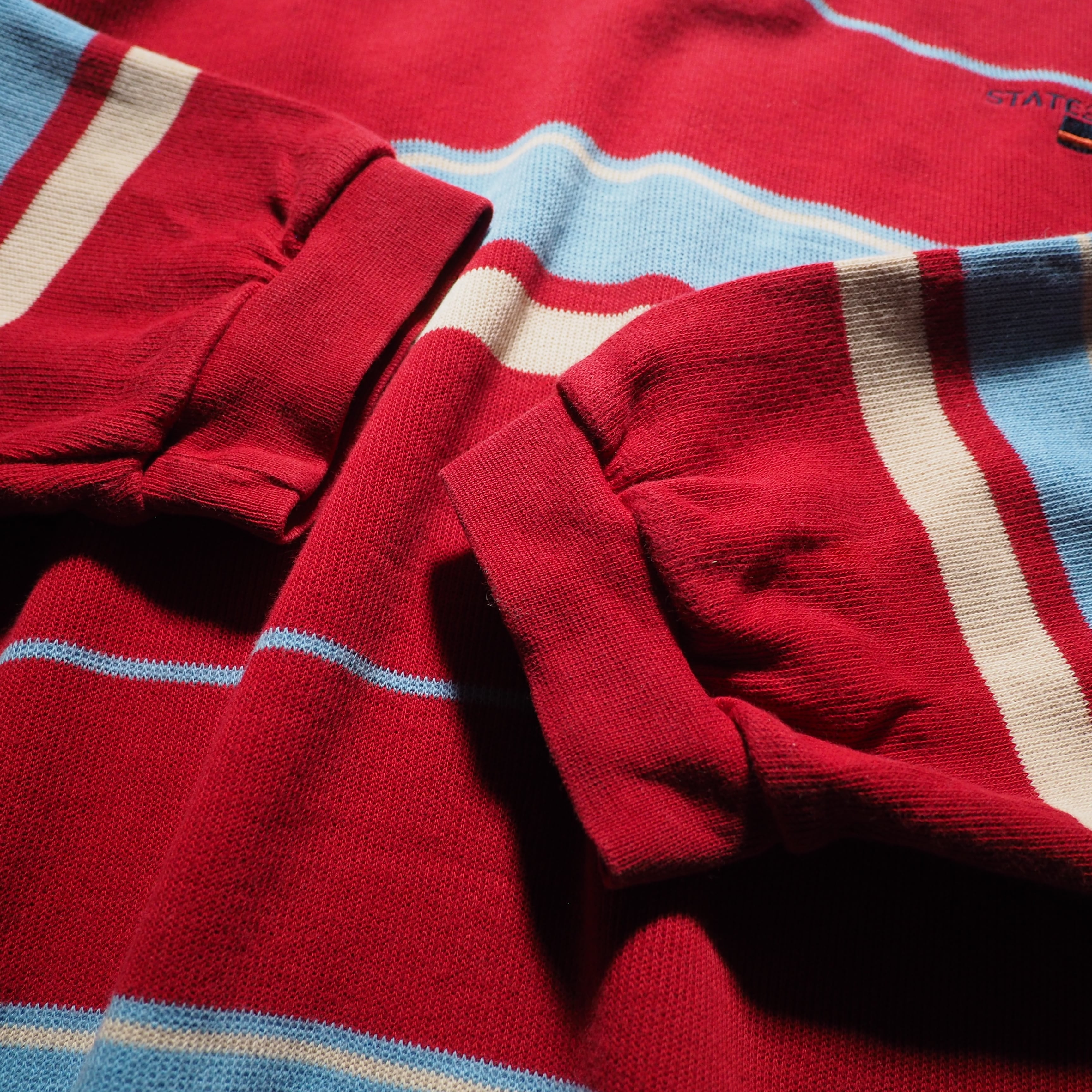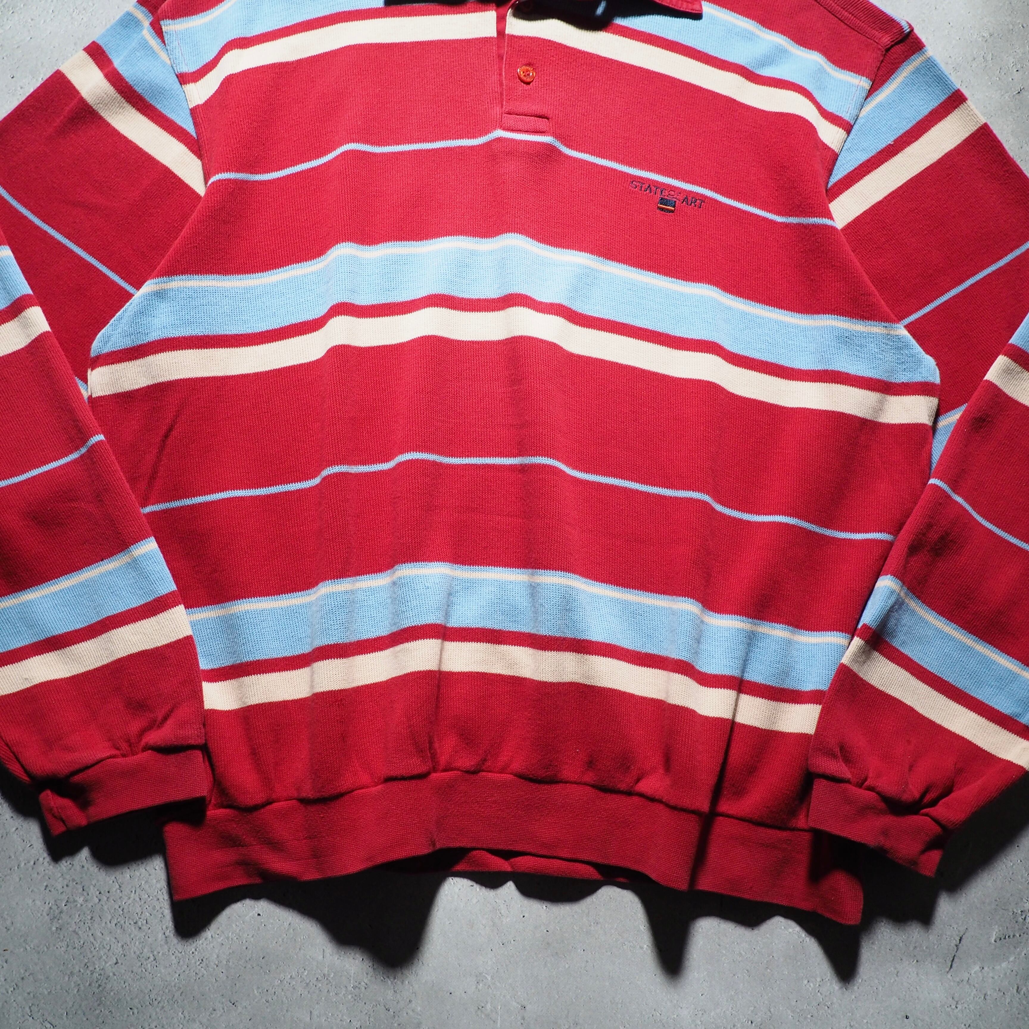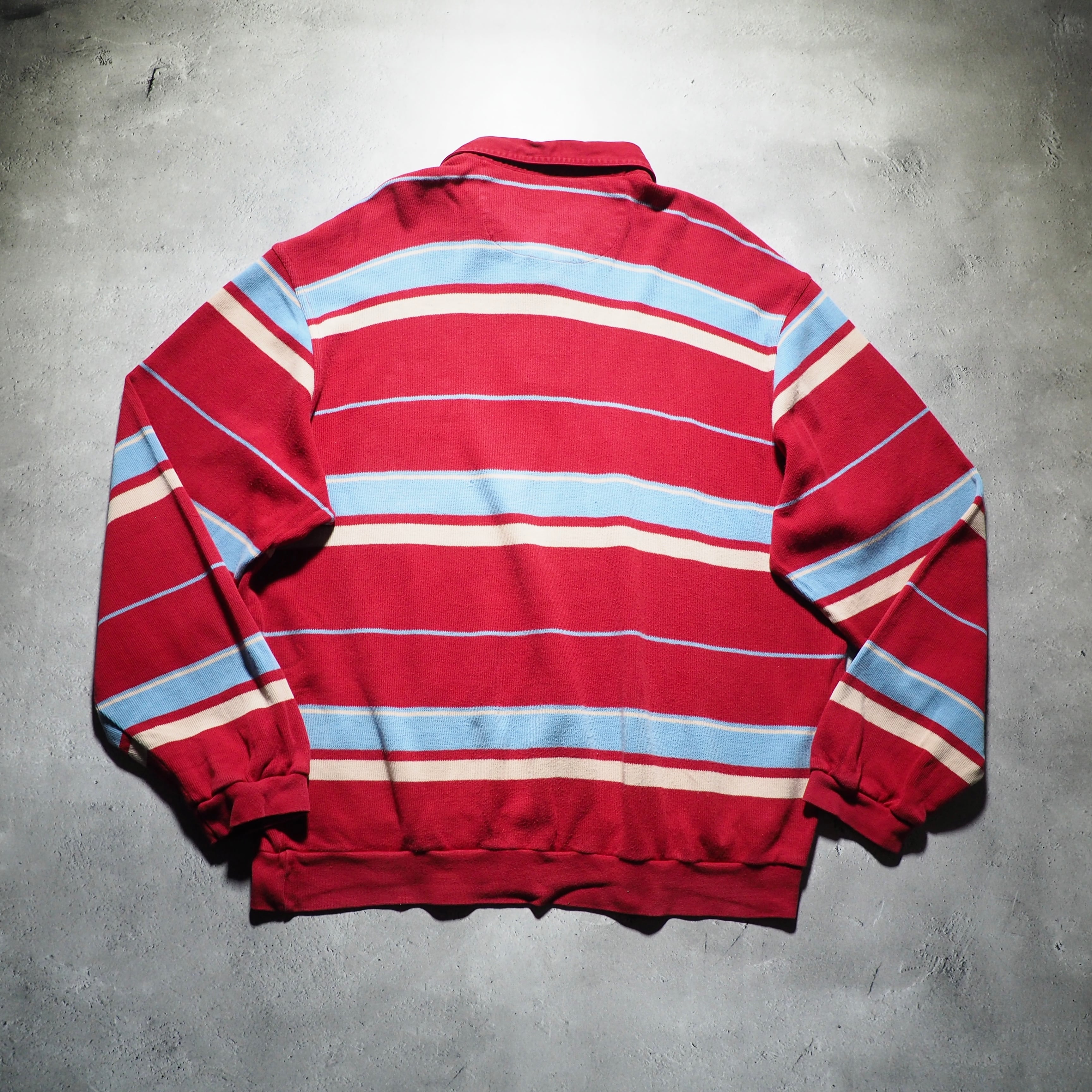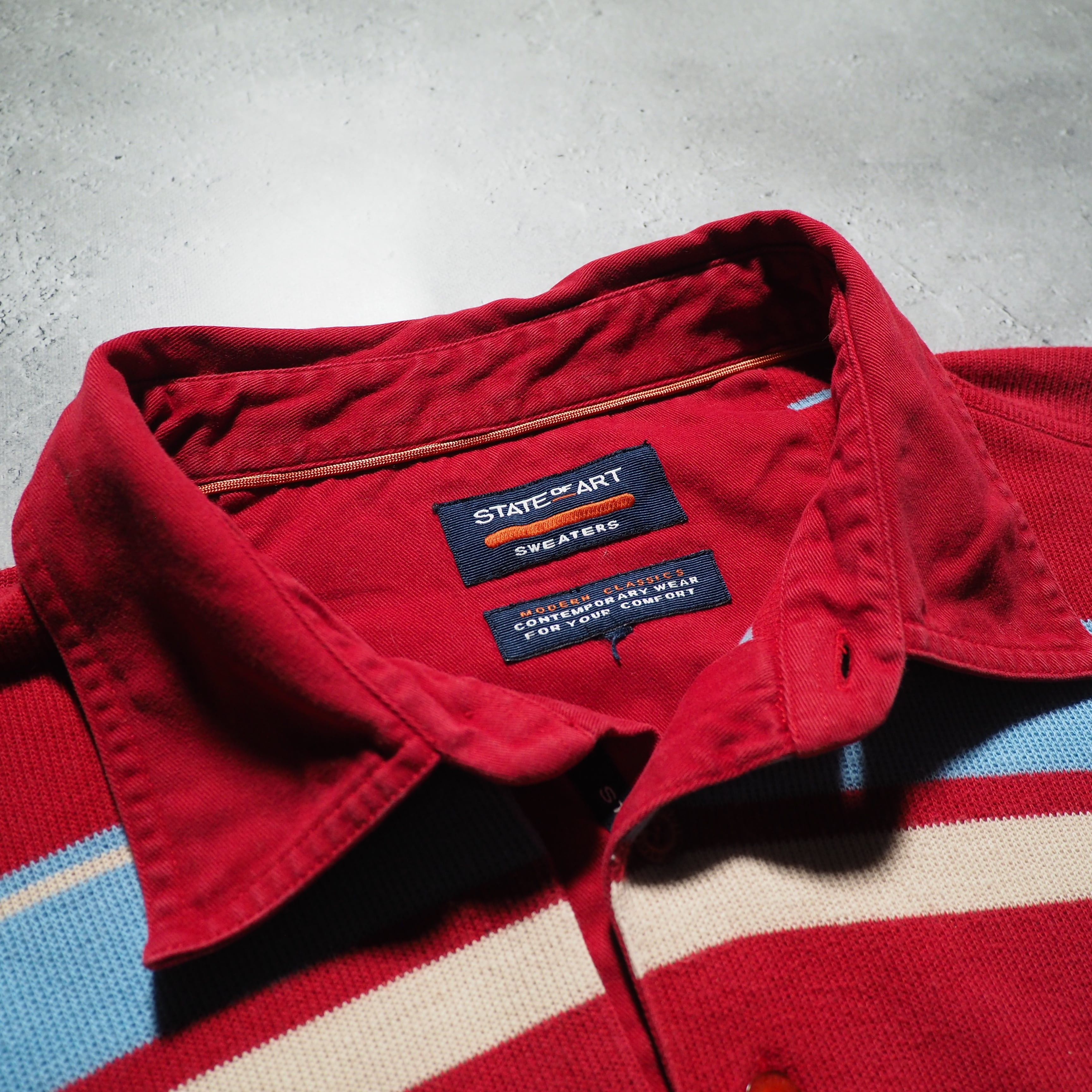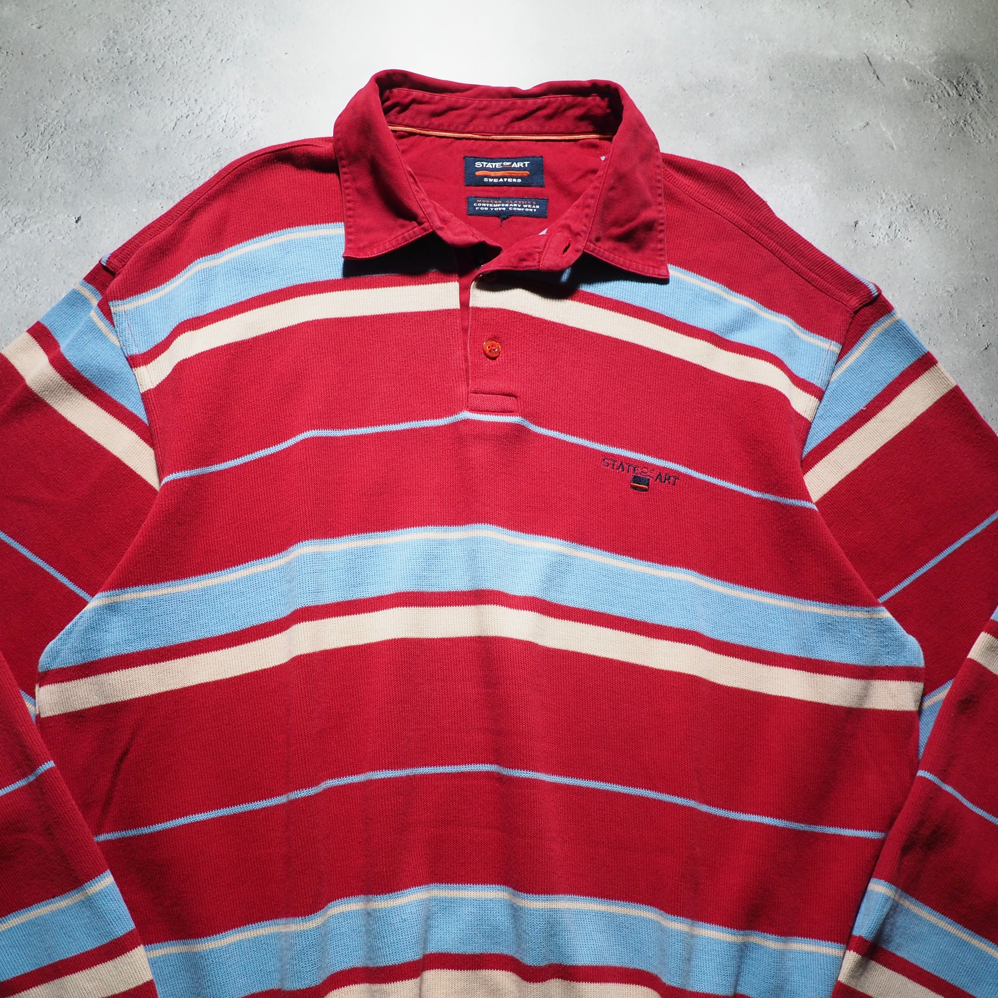 発色の良いレッドを主体としたコットンニットに、ライトブルー、クリームのボーダーラインを組み合わせたニットポロ。お色がただただ可愛い。