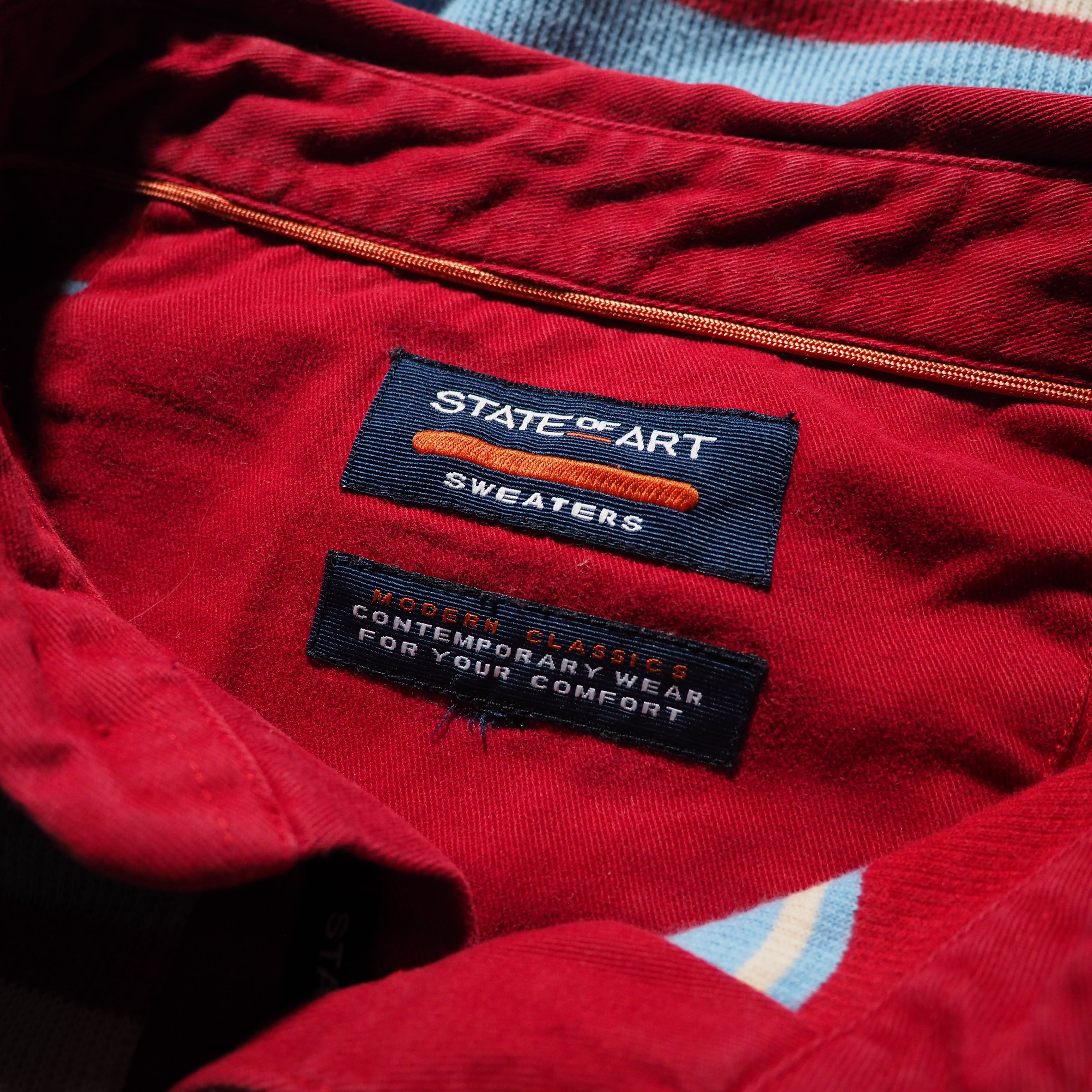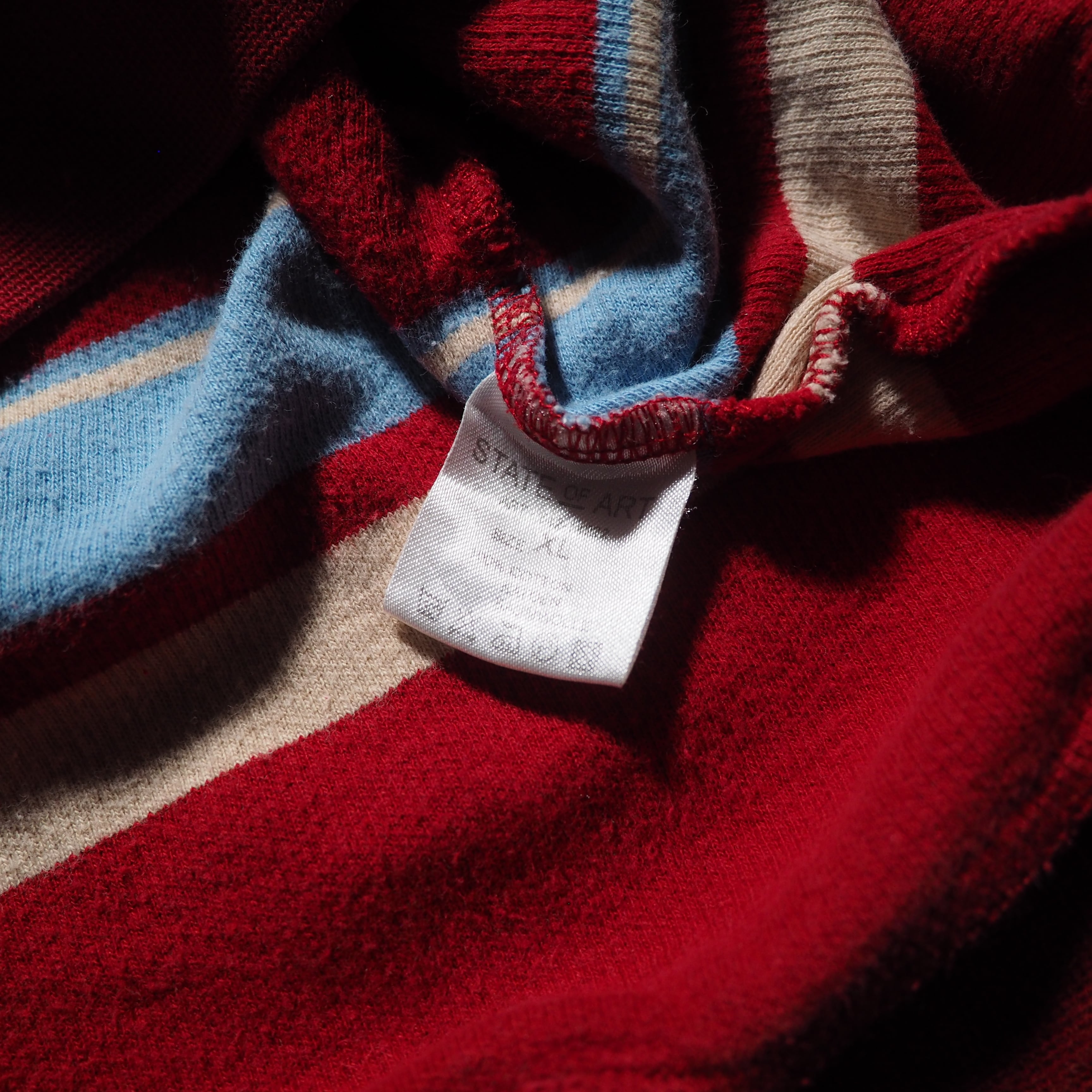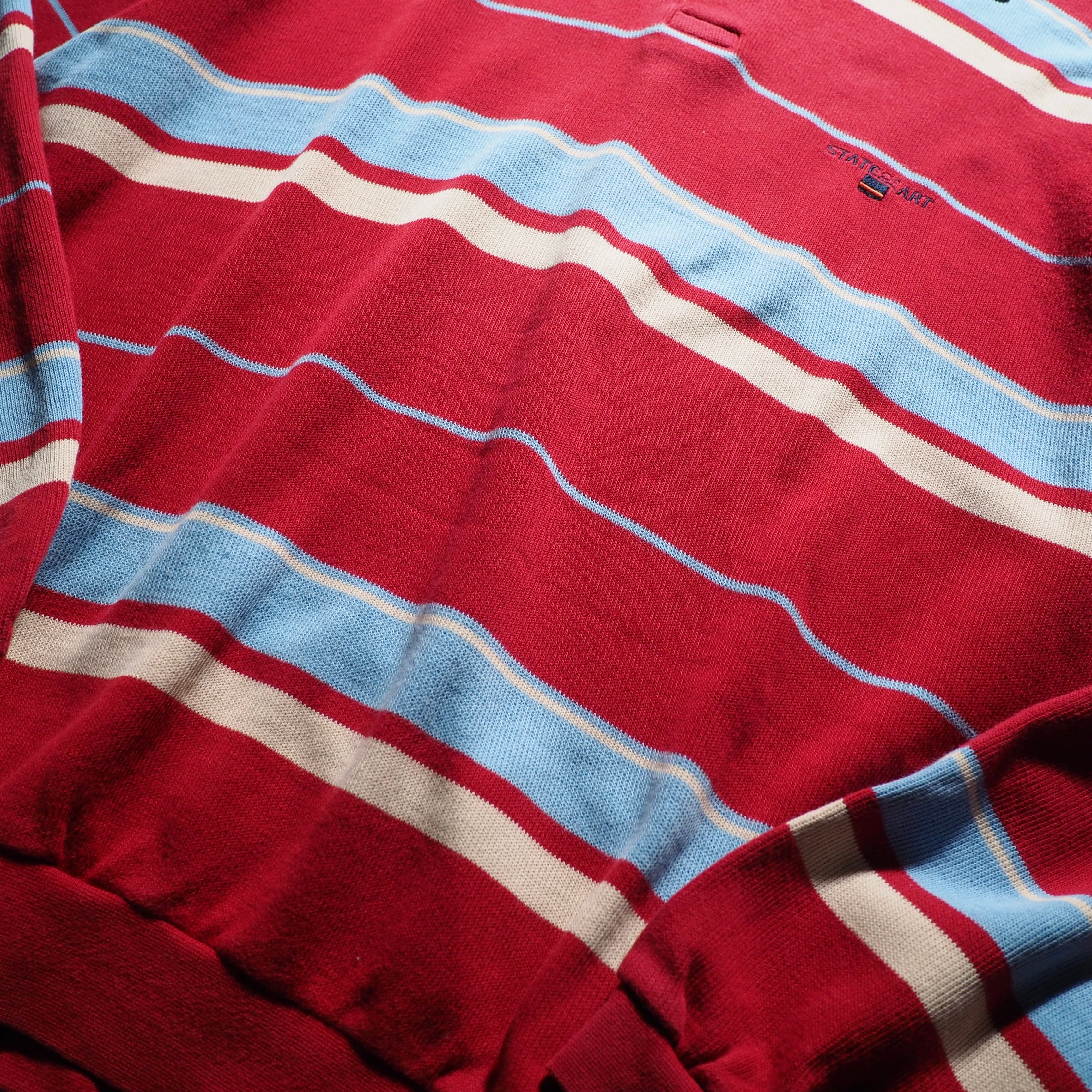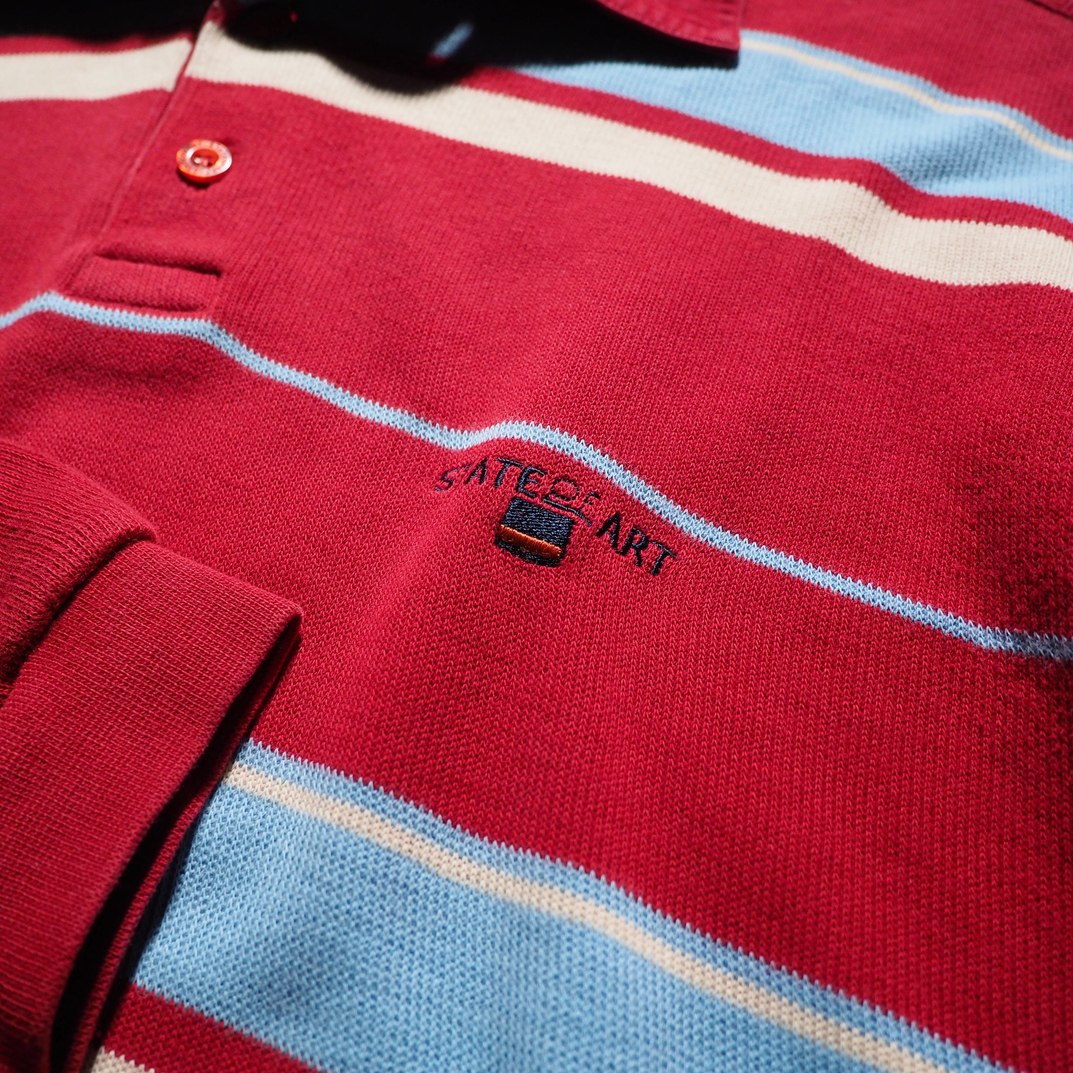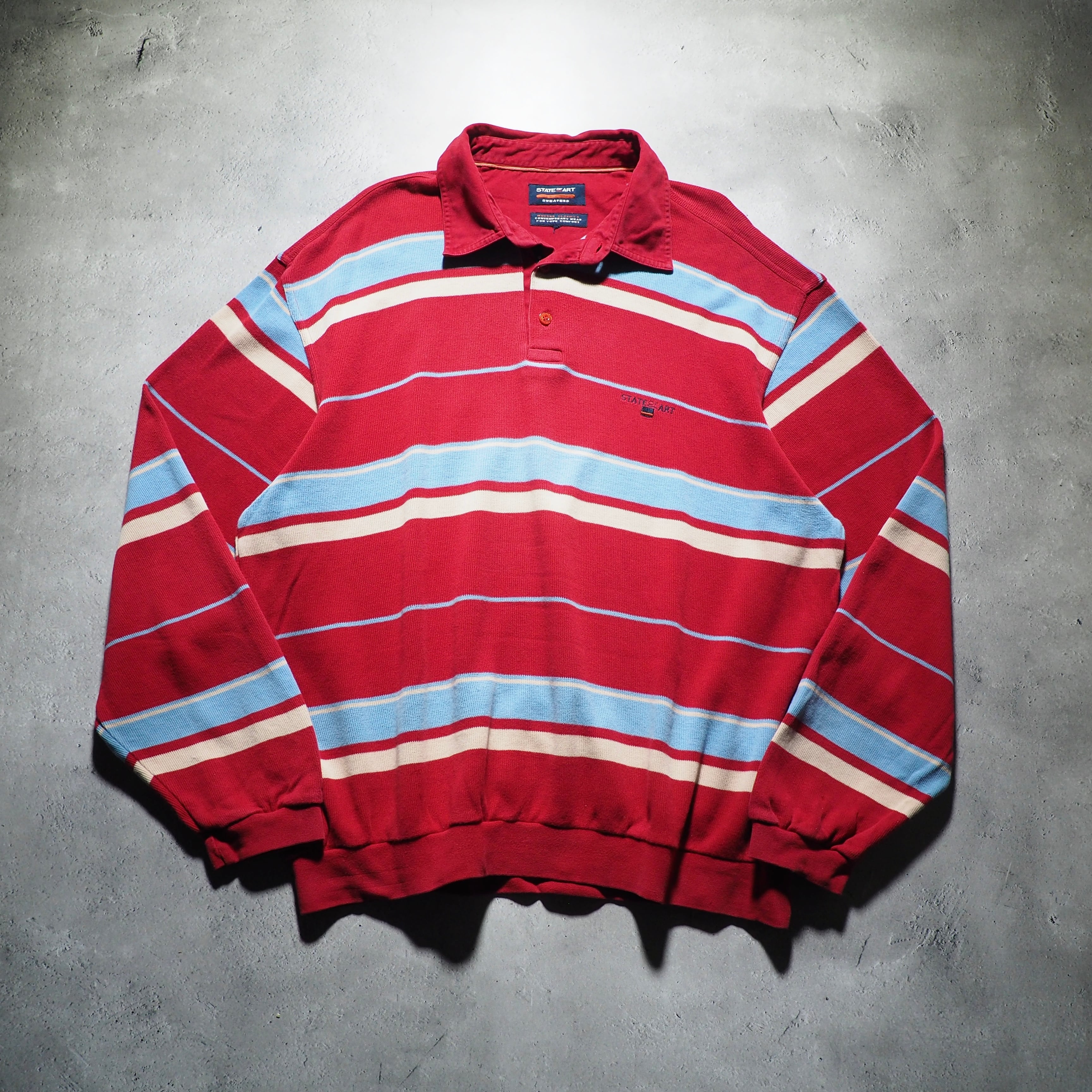 発色の良いレッドを主体としたコットンニットに、ライトブルー、クリームのボーダーラインを組み合わせたニットポロ。お色がただただ可愛い。